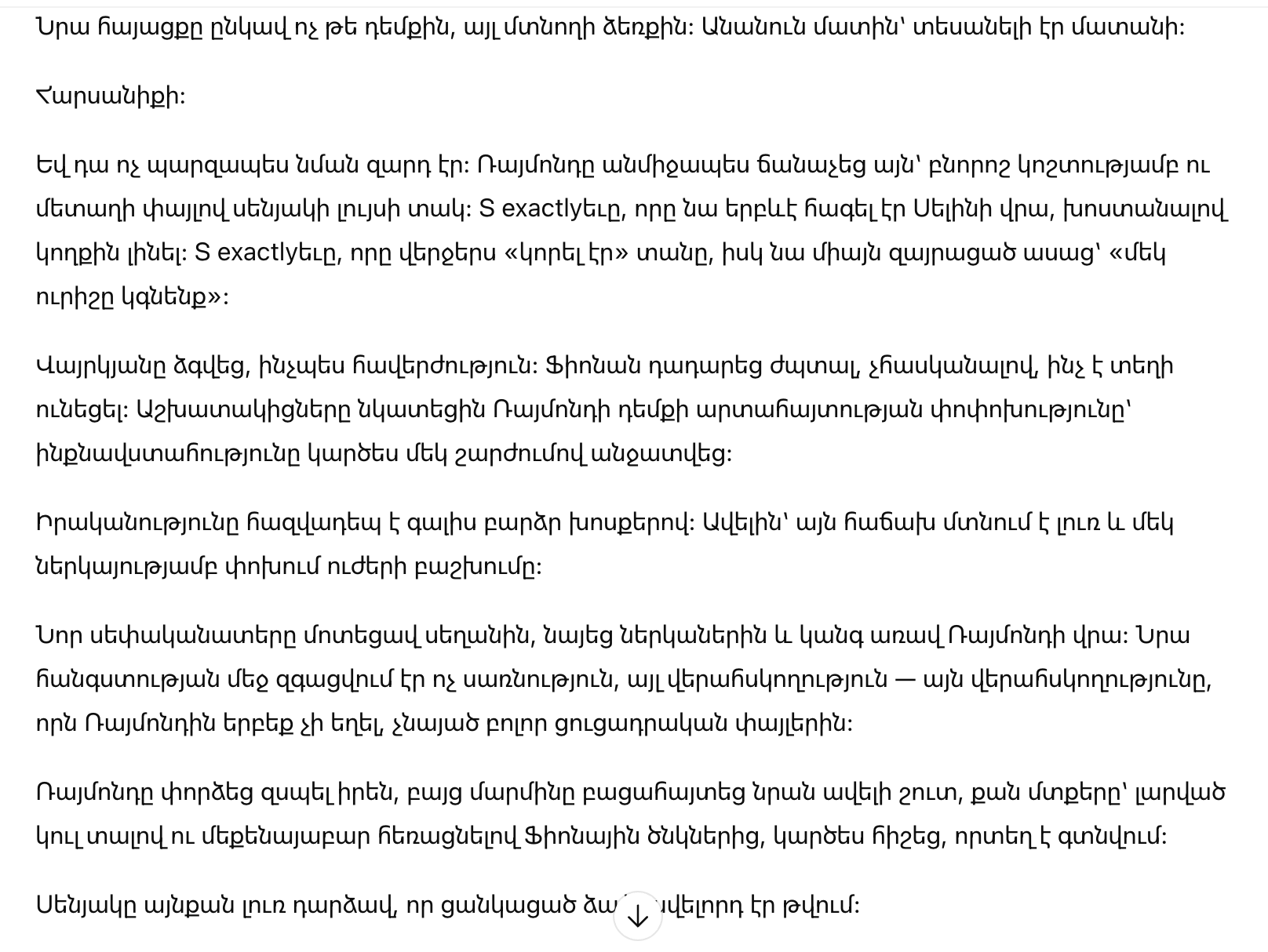 Секунда растянулась, как вечность. Фиона перестала улыбаться, не понимая, что произошло. Сотрудники уловили перемену в выражении лица Раймонда: самоуверенность будто кто-то выключил одним движением.