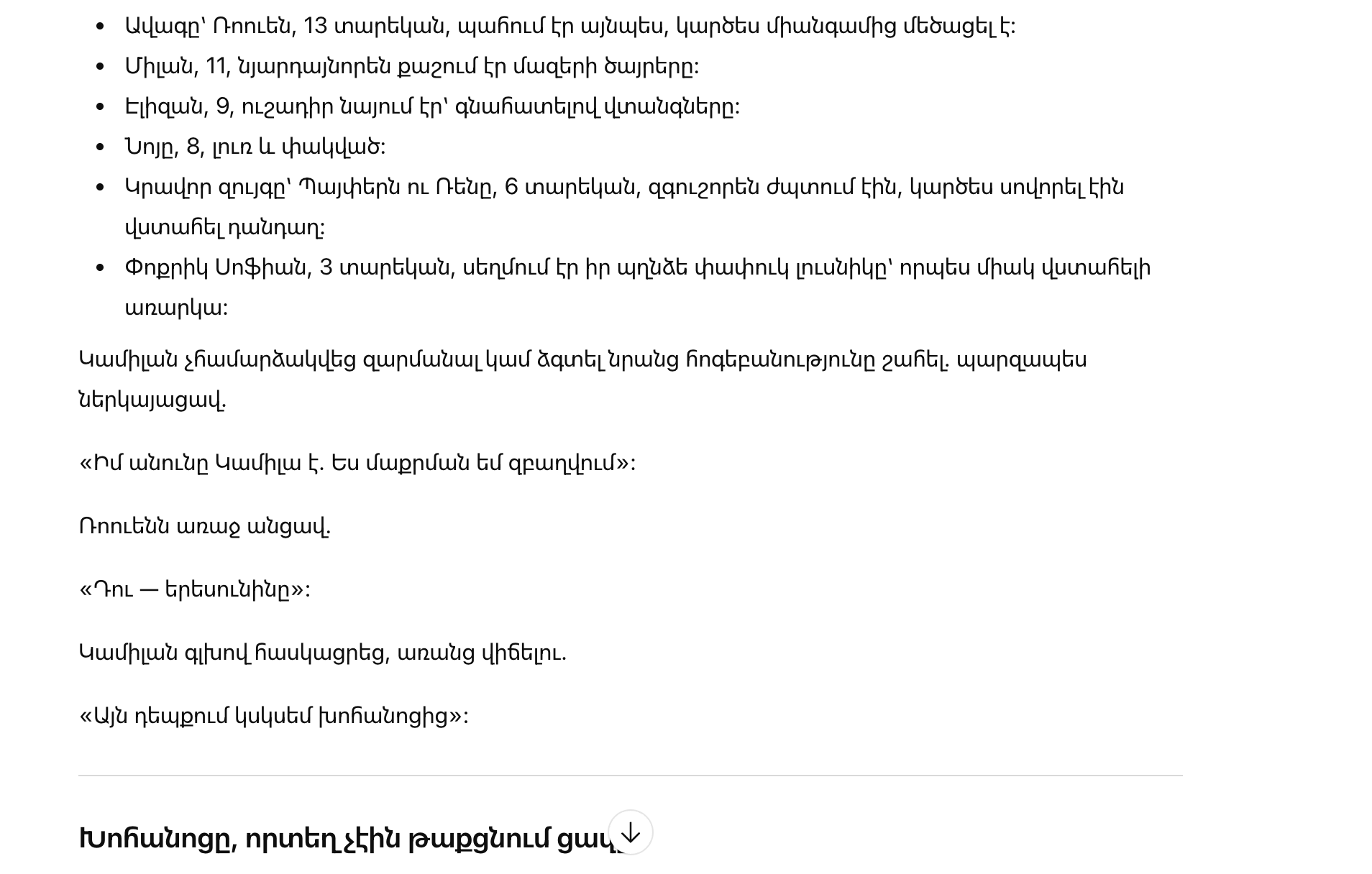 Старшая, Роуэн, тринадцати лет, держалась так, будто в одночасье стала взрослой. Мила, одиннадцать, нервно теребила рукав. Элиза, девяти лет, смотрела внимательно, будто оценивала угрозы. Ной, восемь, был замкнут и молчалив. Шестилетние близняшки Пайпер и Рен улыбались осторожно — как люди, которые разучились доверять быстро. И маленькая София, трех лет, прижимала к себе потрепанного плюшевого лисенка, словно единственную надежную вещь.