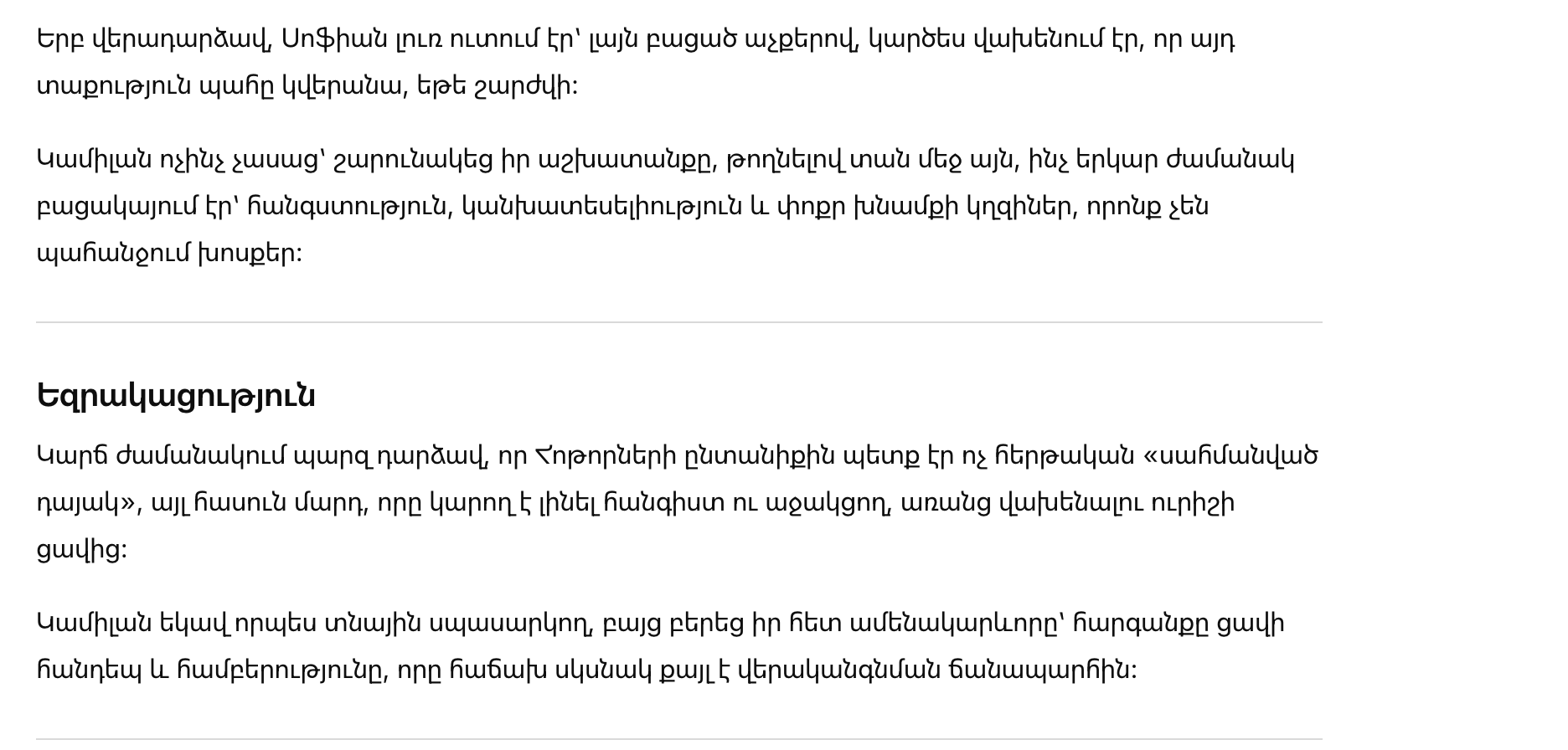 Заключение: за короткое время стало ясно, что семье Хоторнов нужна была не очередная «идеальная няня», а взрослый рядом, который умеет быть тихой опорой и не пугается чужой боли. Камила пришла как домработница, но принесла с собой главное — уважение к горю и терпение, с которого часто начинается путь к восстановлению.