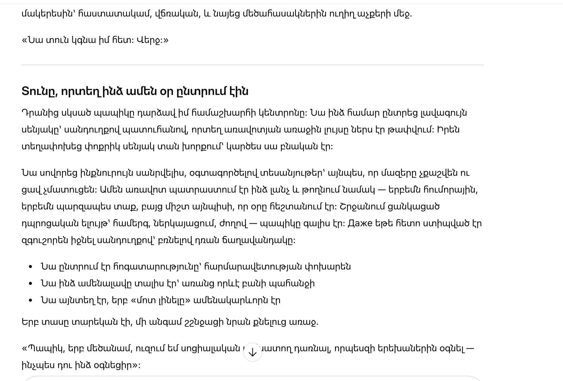 Он учился заплетать мне волосы по видео, чтобы не дёргать пряди и не делать больно. Каждое утро собирал мне ланч и оставлял записку — иногда смешную, иногда просто тёплую, но всегда такую, от которой день становился легче. И где бы ни было школьное выступление — концерт, спектакль, собрание — дедушка приходил. Даже если потом ему приходилось осторожно спускаться по лестнице, держась за перила.