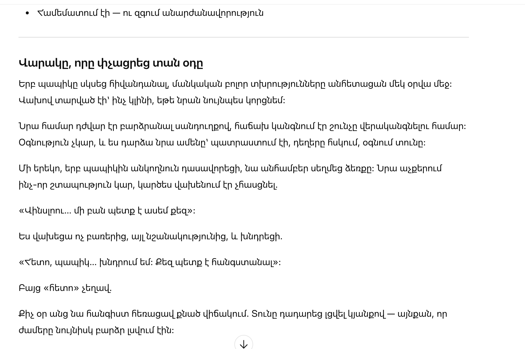 Однажды вечером, когда я уложила дедушку, он неожиданно крепко сжал мою ладонь. В глазах было что‑то срочное, будто он боялся не успеть.