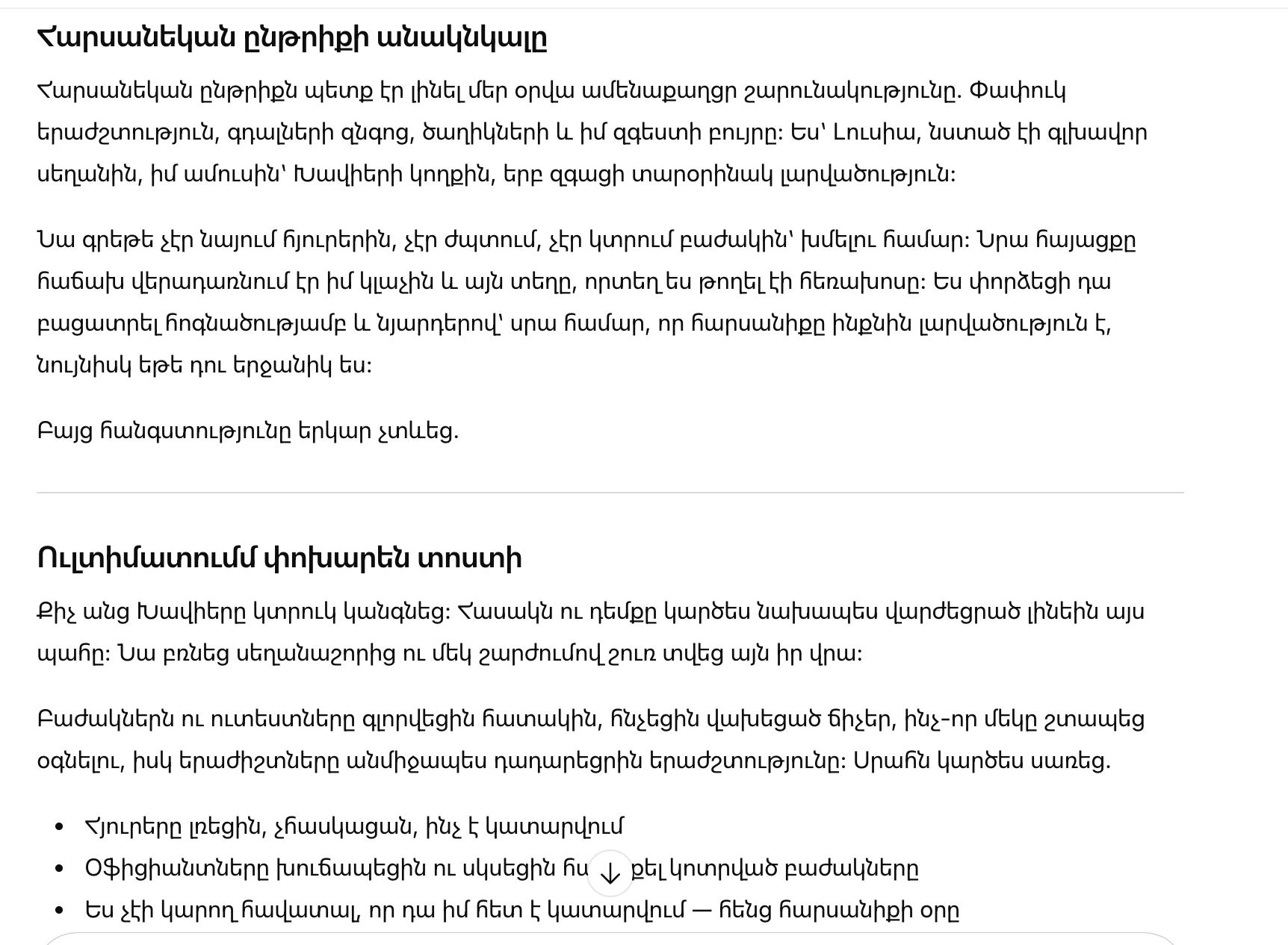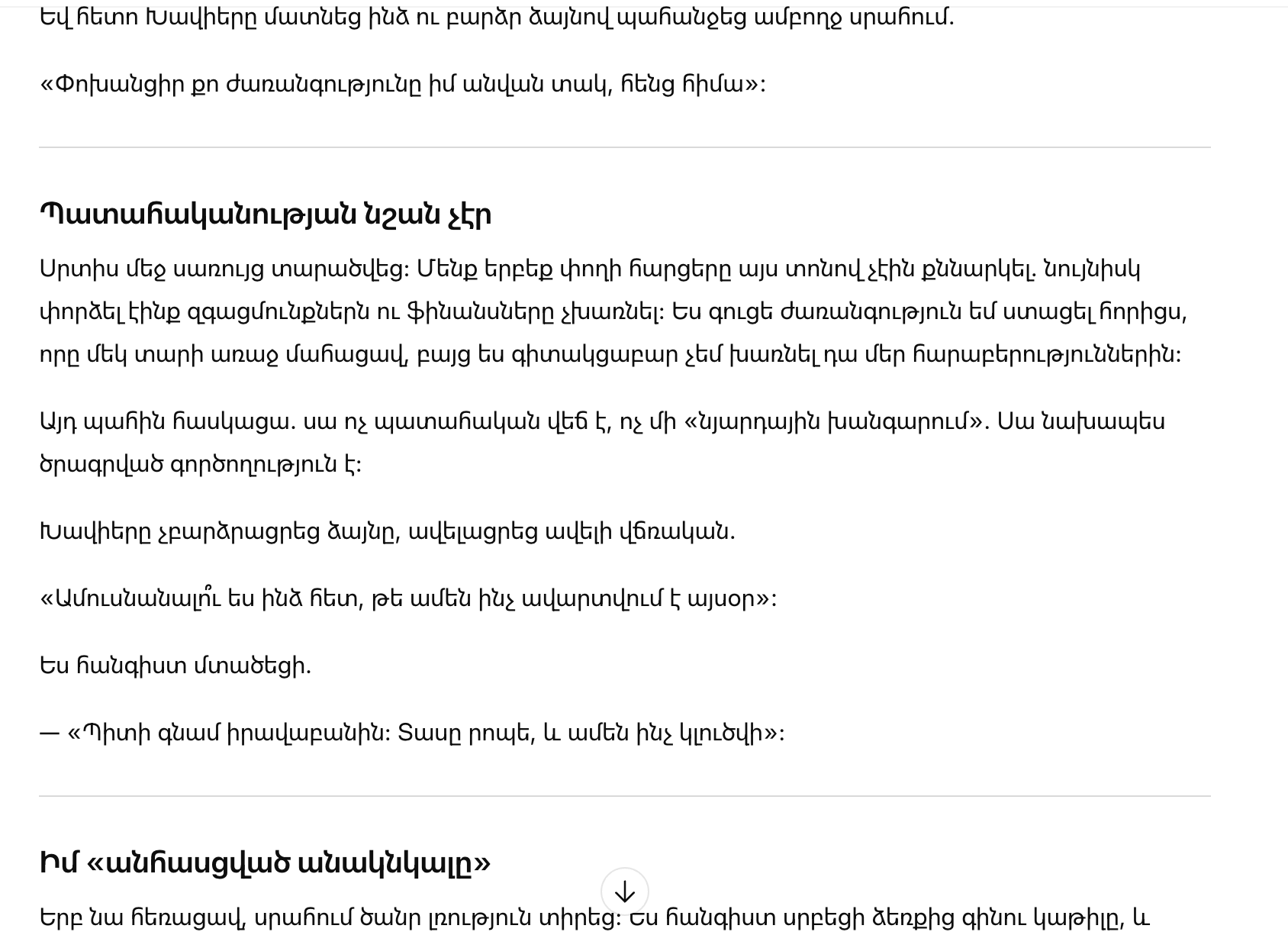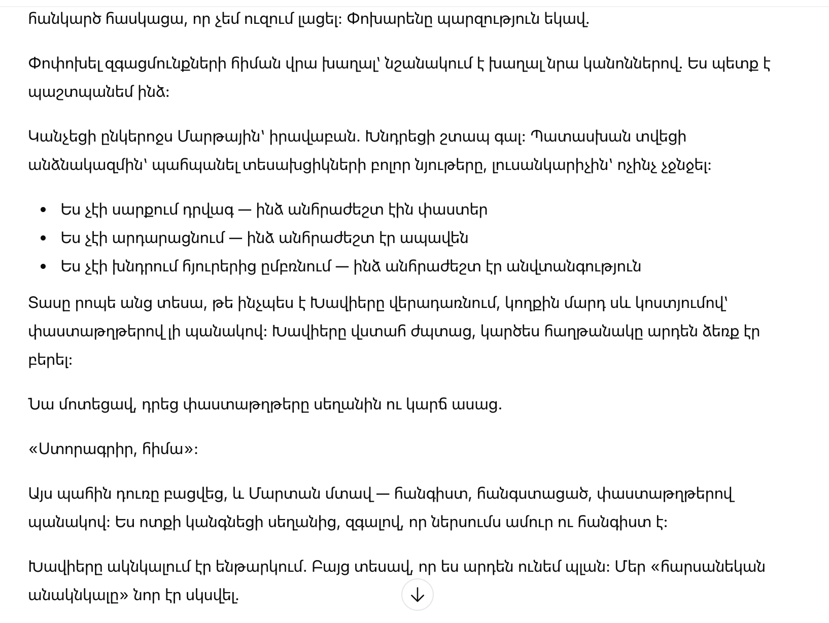 Когда он ушёл, в зале повисло тяжёлое молчание. Я аккуратно вытерла с запястья каплю вина и вдруг почувствовала, что плакать мне сейчас не хочется. Вместо этого пришла ясность: спорить на эмоциях — значит играть по его правилам. А я должна защитить себя.