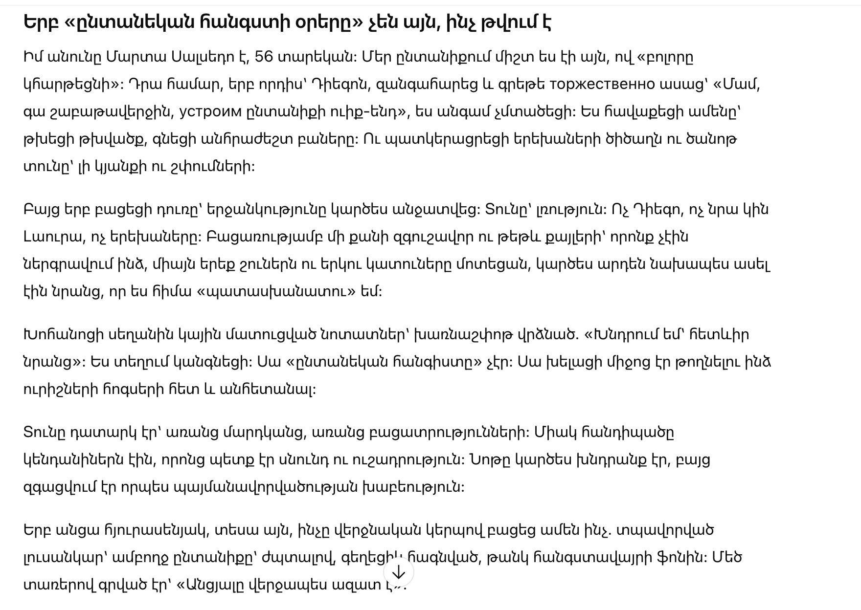Меня зовут Марта Сальседо, мне 56, и в нашей семье я всегда была той, кто «всё уладит». Поэтому, когда сын Диего позвонил и почти торжественно сказал: «Мам, приезжай на выходные, устроим семейный уик-энд», я даже не задумалась. Я собралась, испекла пирог, купила продукты — в голове уже звучали голоса, смех детей и привычная домашняя суета.