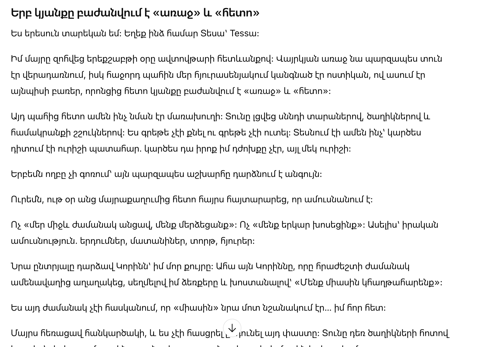 «Тесса», — произнёс он тихо, и в горле у него будто застряли слова. — «Мне нужно тебе кое-что сказать».