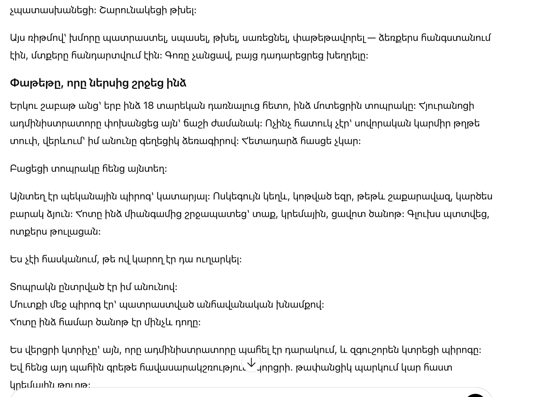 Часть страховой выплаты, которая должна была поддержать меня после пожара, тётя забрала себе — уверяя, что это «временно» и «ради моего же блага». Потом я узнала, на что это ушло: новые покупки, обновления, вещи «для настроения». Я не спорила. У меня не было сил ругаться. Я просто училась выживать в новых условиях — с матрасом, столом и обязательной тишиной по ночам.