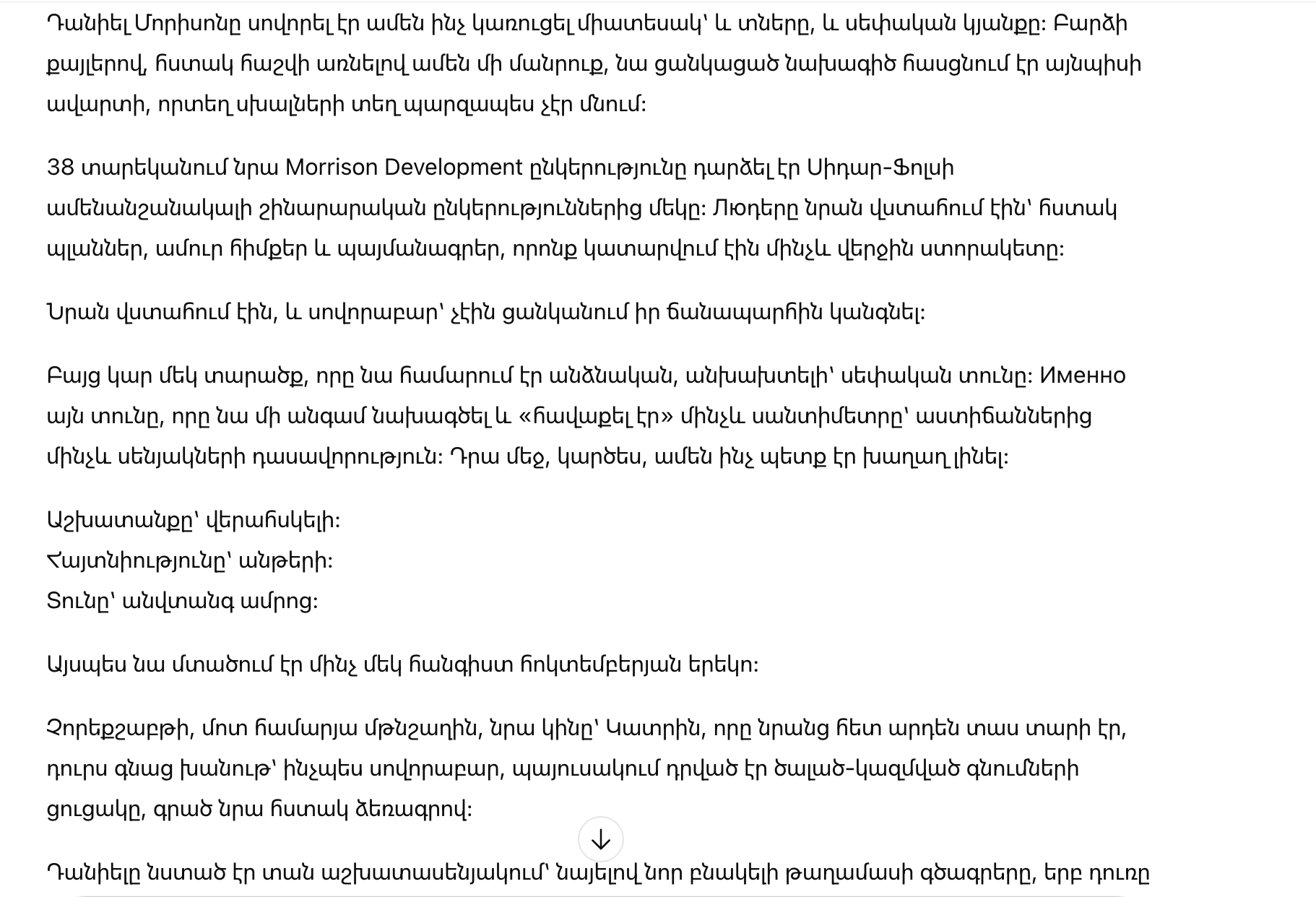 К тридцати восьми годам его компания Morrison Development стала самой заметной среди застройщиков в Сидар-Фолс. Люди видели в нём надёжность: аккуратные планы, крепкие фундаменты и договоры, которые выполнялись до последней запятой.