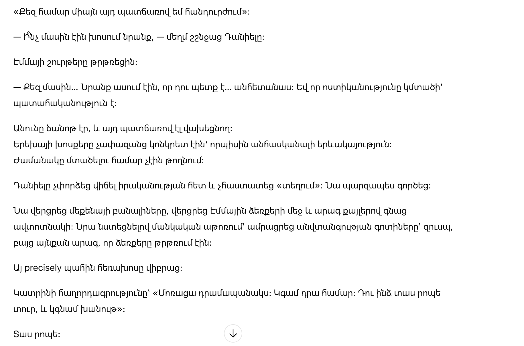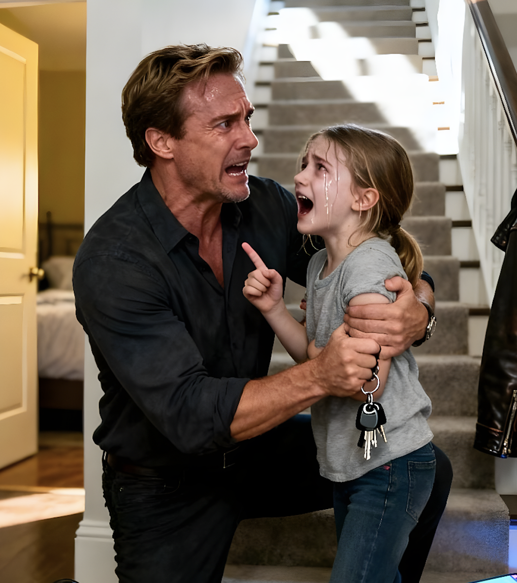 Дэниел присел перед дочерью, стараясь, чтобы голос звучал спокойно — мягко, по-отцовски, как будто от этого зависела безопасность их двоих.