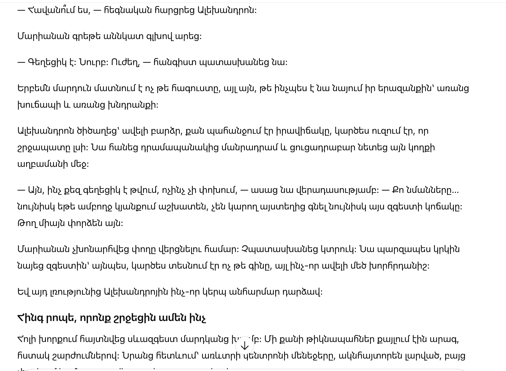 — Красивое. Тонкое. Сильное, — спокойно ответила она.