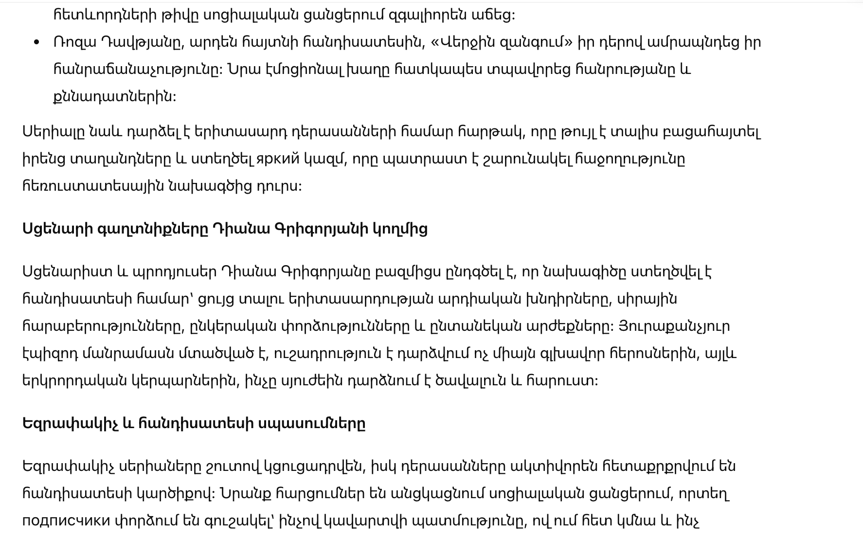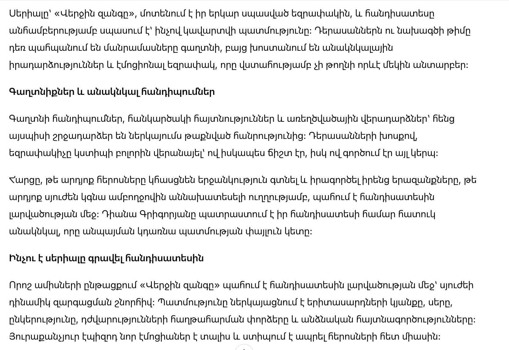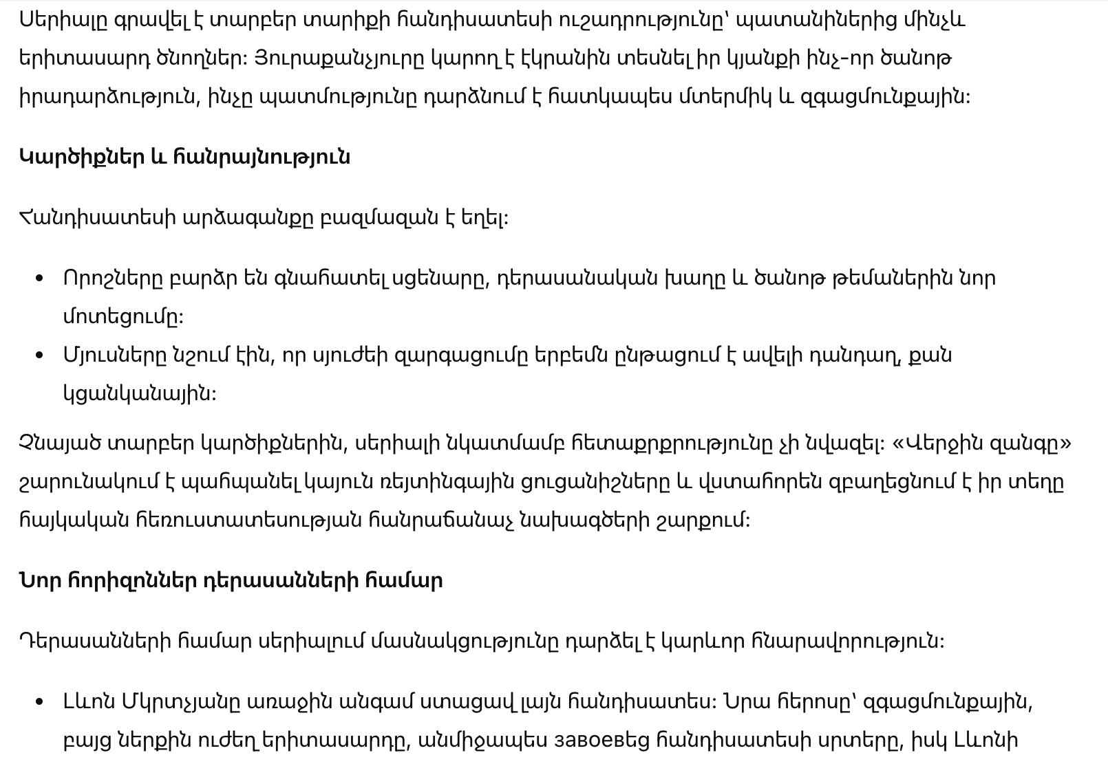 Несмотря на разные мнения, интерес к сериалу не угасает. «Последний звонок» продолжает удерживать стабильные рейтинги и уверенно занимает свое место среди популярных проектов на армянском телевидении.