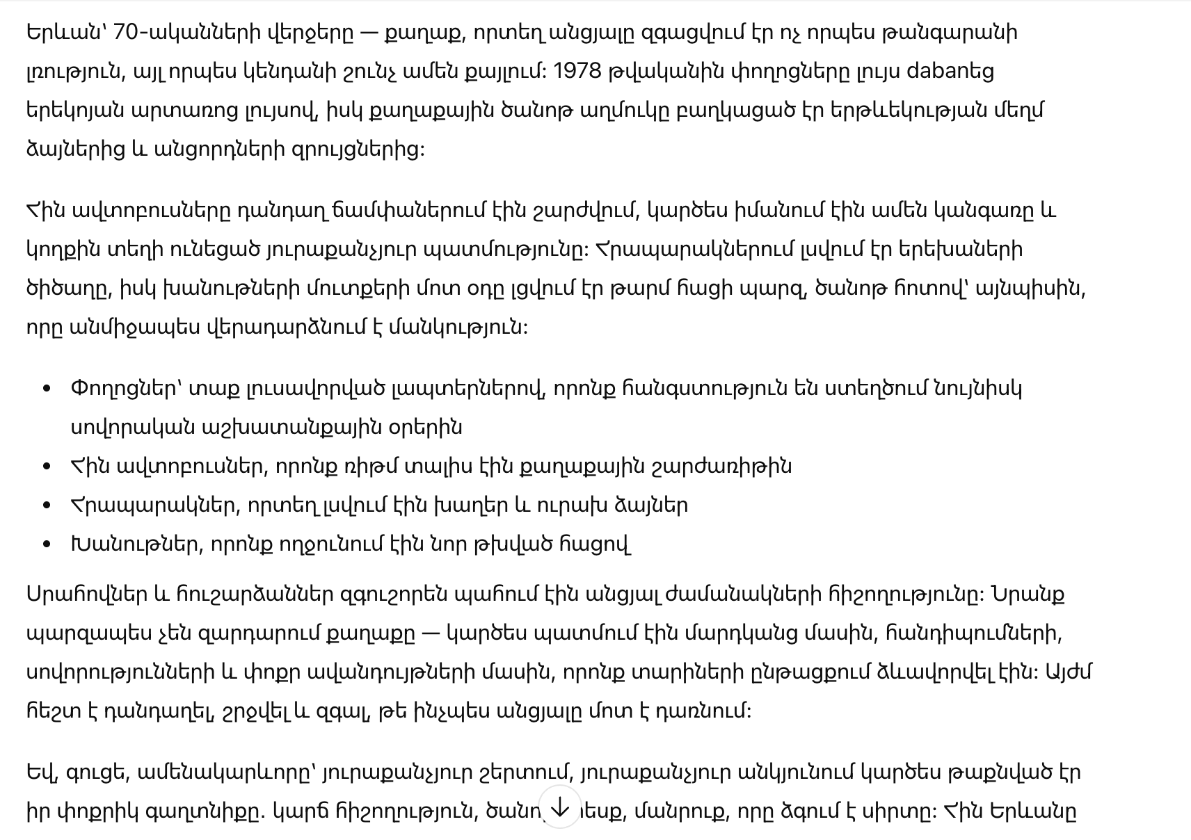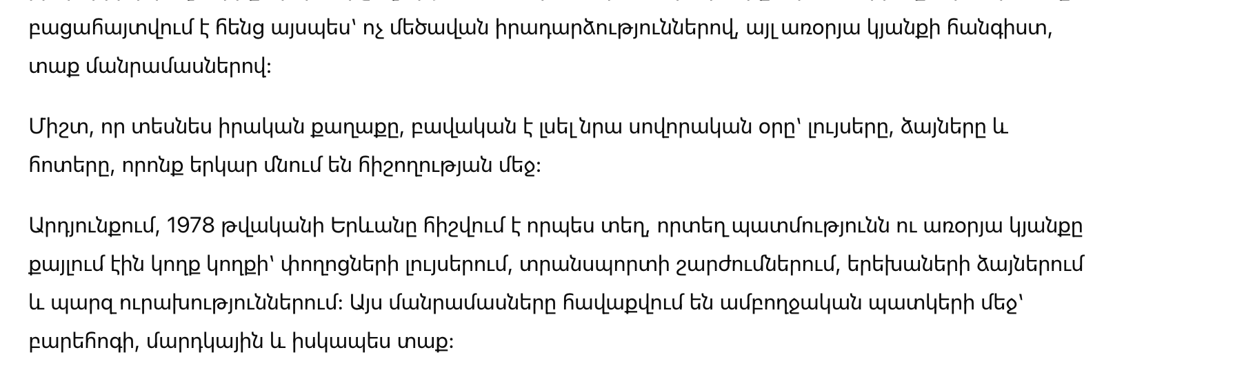 В итоге Ереван 1978 года запоминается как место, где история и повседневная жизнь шли рядом: в огнях улиц, в движении транспорта, в детских голосах и в простых радостях. Эти детали складываются в цельную картину — добрую, человечную и по-настоящему тёплую.