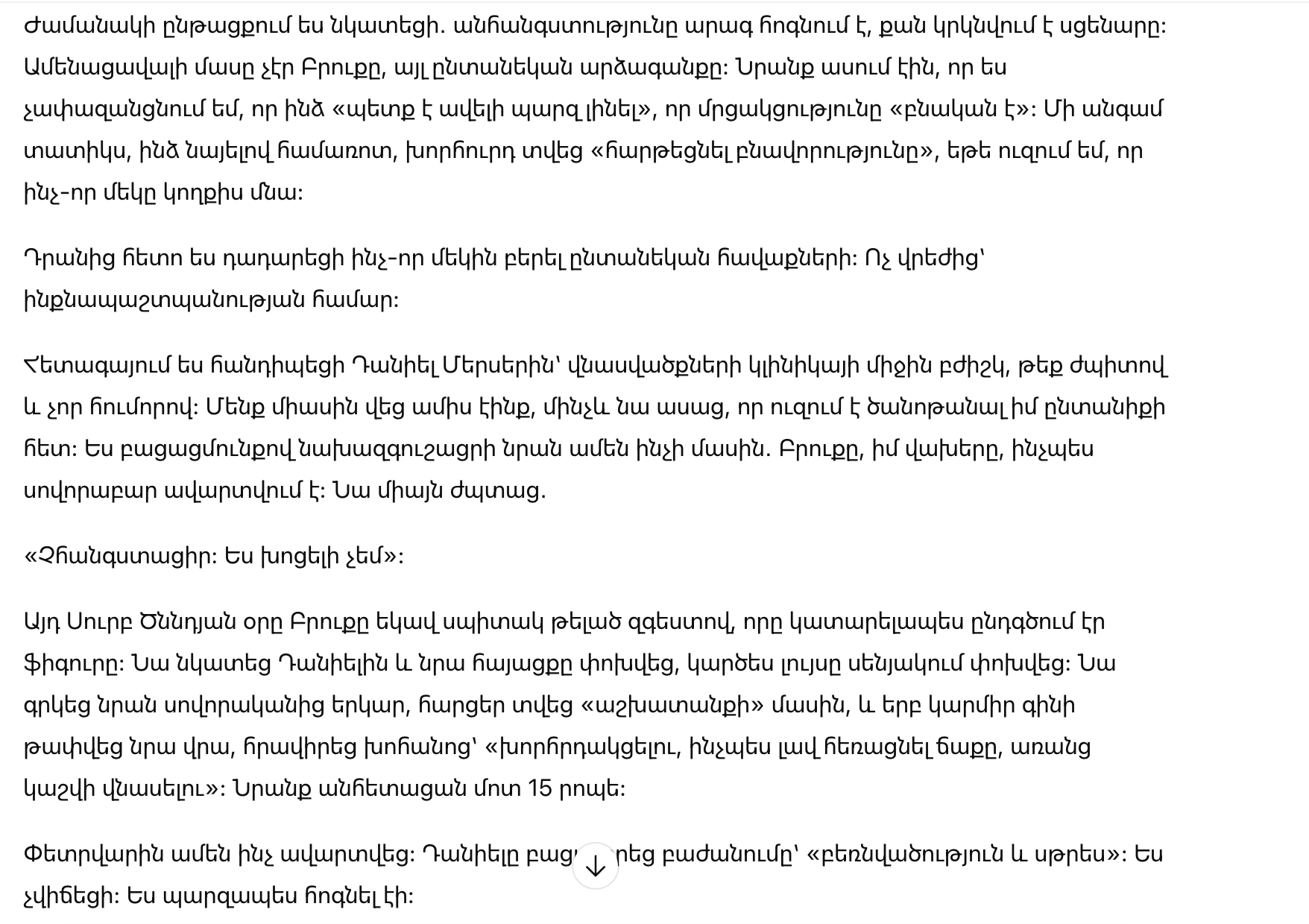 Позже я встретила Дэниела Мерсера — ординатора травматологии, с кривоватой улыбкой и сухим чувством юмора. Мы были вместе восемь месяцев, прежде чем он сказал, что хочет познакомиться с моей семьёй. Я честно предупредила его обо всём: о Брук, о моих опасениях, о том, как это обычно заканчивается. Он только усмехнулся: