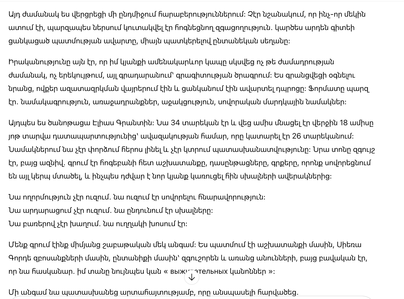 Так я познакомилась с Элиасом Грантом. Ему было тридцать четыре, и он отбывал последние восемнадцать месяцев из семи лет — за ограбление, совершённое в двадцать шесть. В письмах он не пытался выглядеть героем и не перекладывал ответственность. Его тон был осторожным, но честным: он писал про работу с психологом, про курсы, про книги, которые учат думать иначе, и про то, как сложно выстраивать новую жизнь из руин старых решений.