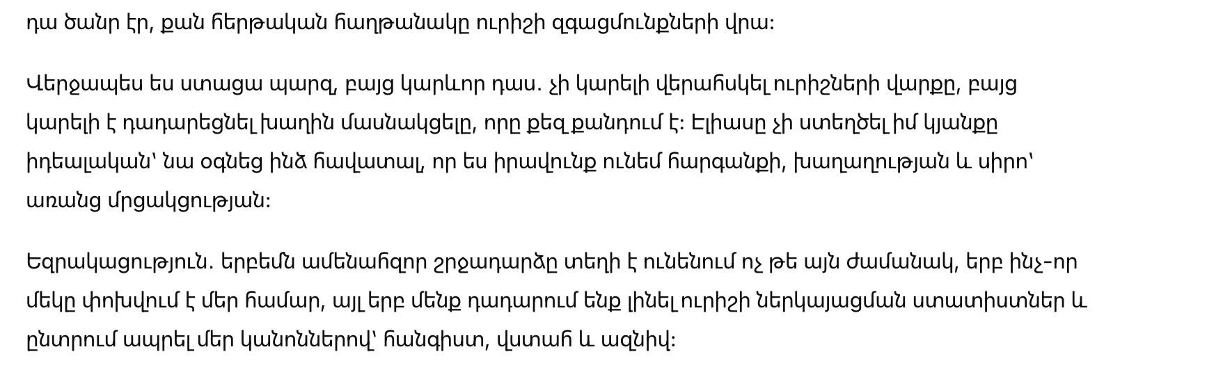 В итоге я вынесла простой, но важный урок: нельзя контролировать чужое поведение, но можно перестать участвовать в игре, которая тебя разрушает. Элиас не сделал мою жизнь идеальной — он помог мне поверить, что я имею право на уважение, спокойствие и любовь без соревнования.