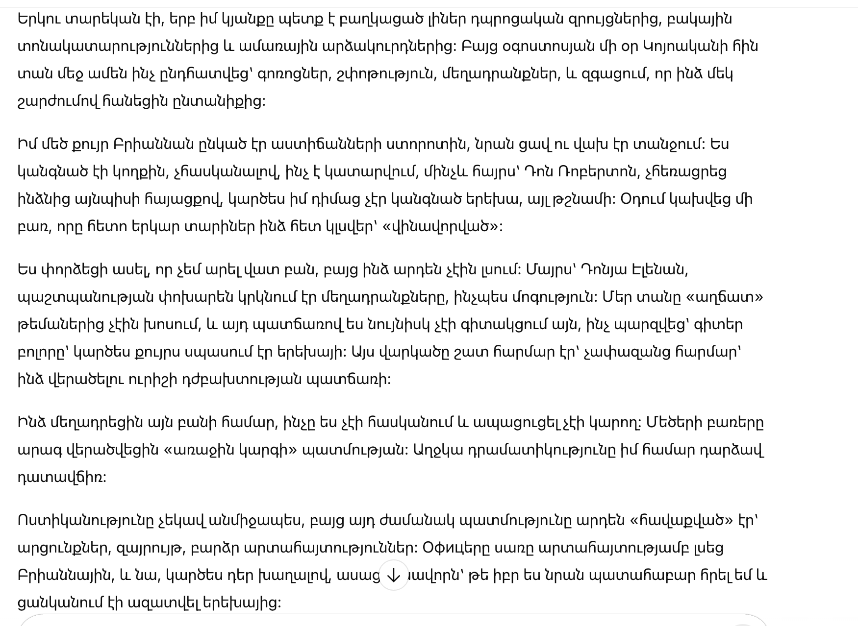 Я пыталась сказать, что не делала ничего плохого. Но меня уже не слушали. Мама — До́ня Елена — вместо защиты повторяла обвинения, как заклинание. В нашем доме о «стыдных» темах не говорили, и поэтому я даже не знала того, что, как выяснилось, знали все: будто бы сестра ждала ребёнка. Эта версия стала удобной — слишком удобной — чтобы превратить меня в причину чужой беды.