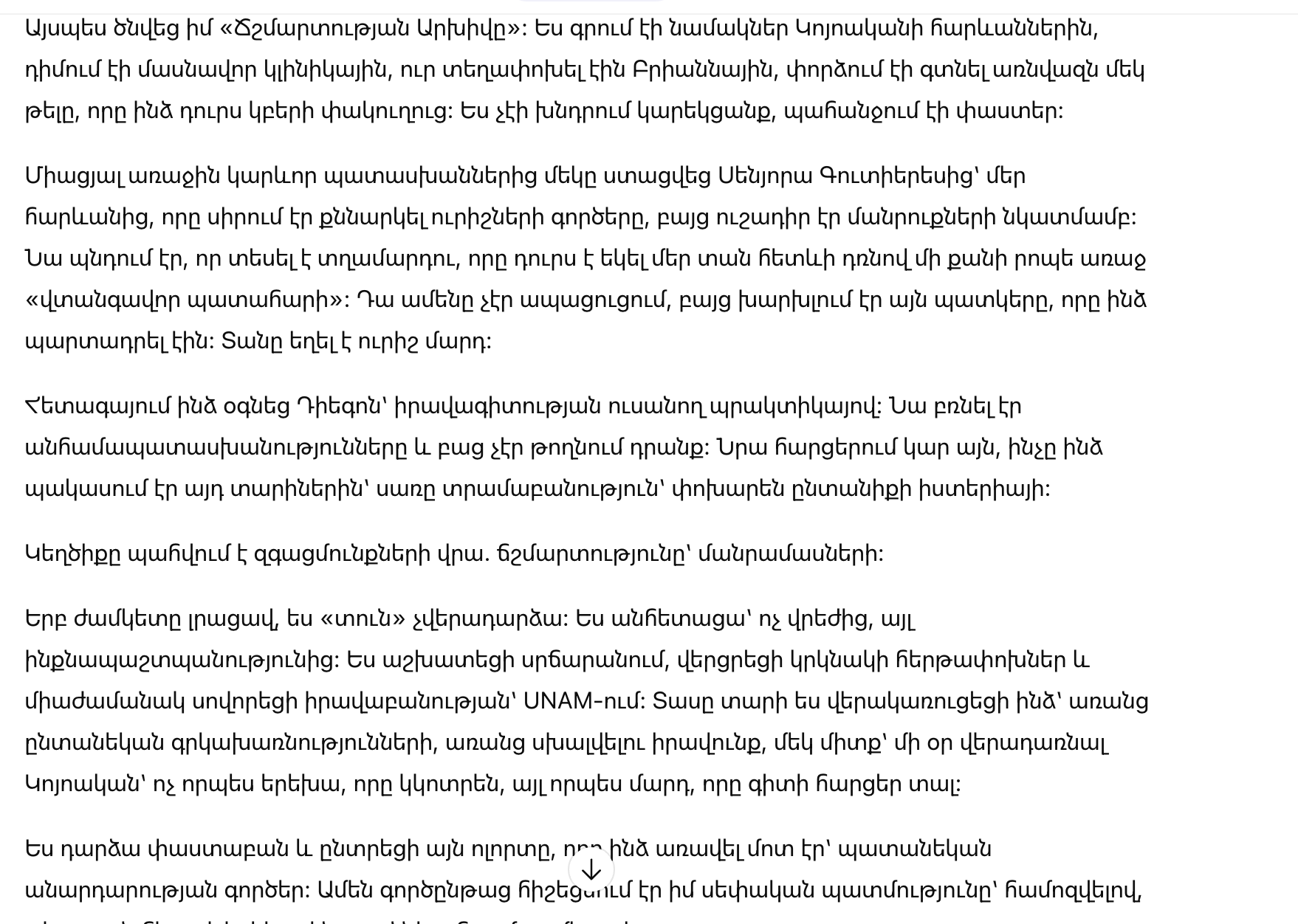 Когда срок закончился, я не вернулась «домой». Я исчезла — не из мести, а из самозащиты. Я работала в кафе, брала двойные смены и параллельно училась на юриста в UNAM. Десять лет я строила себя заново: без фамильных объятий, без права на ошибку, с одной мыслью — однажды вернуться в Койоакан не ребёнком, которого можно сломать, а человеком, который умеет задавать вопросы.