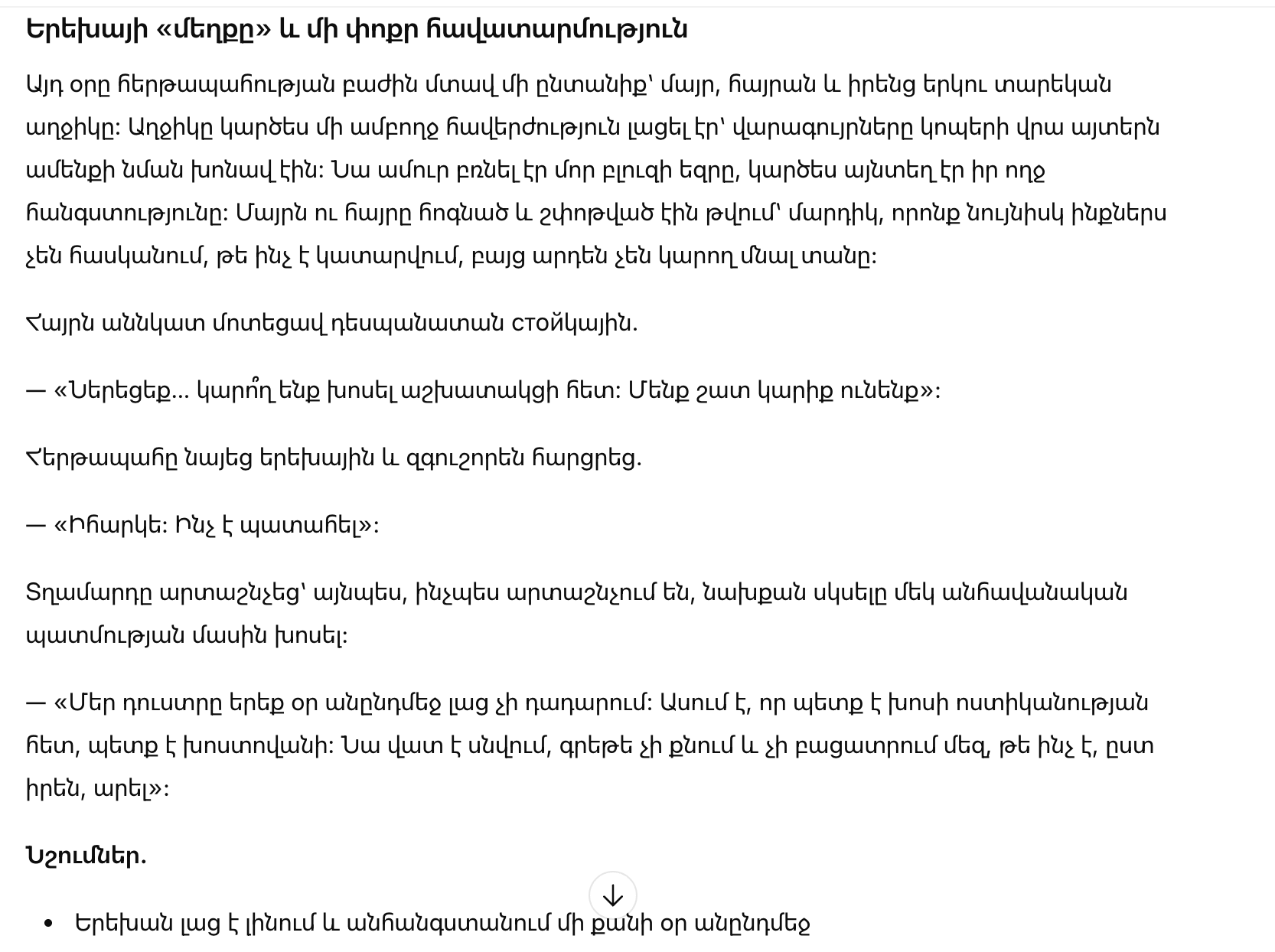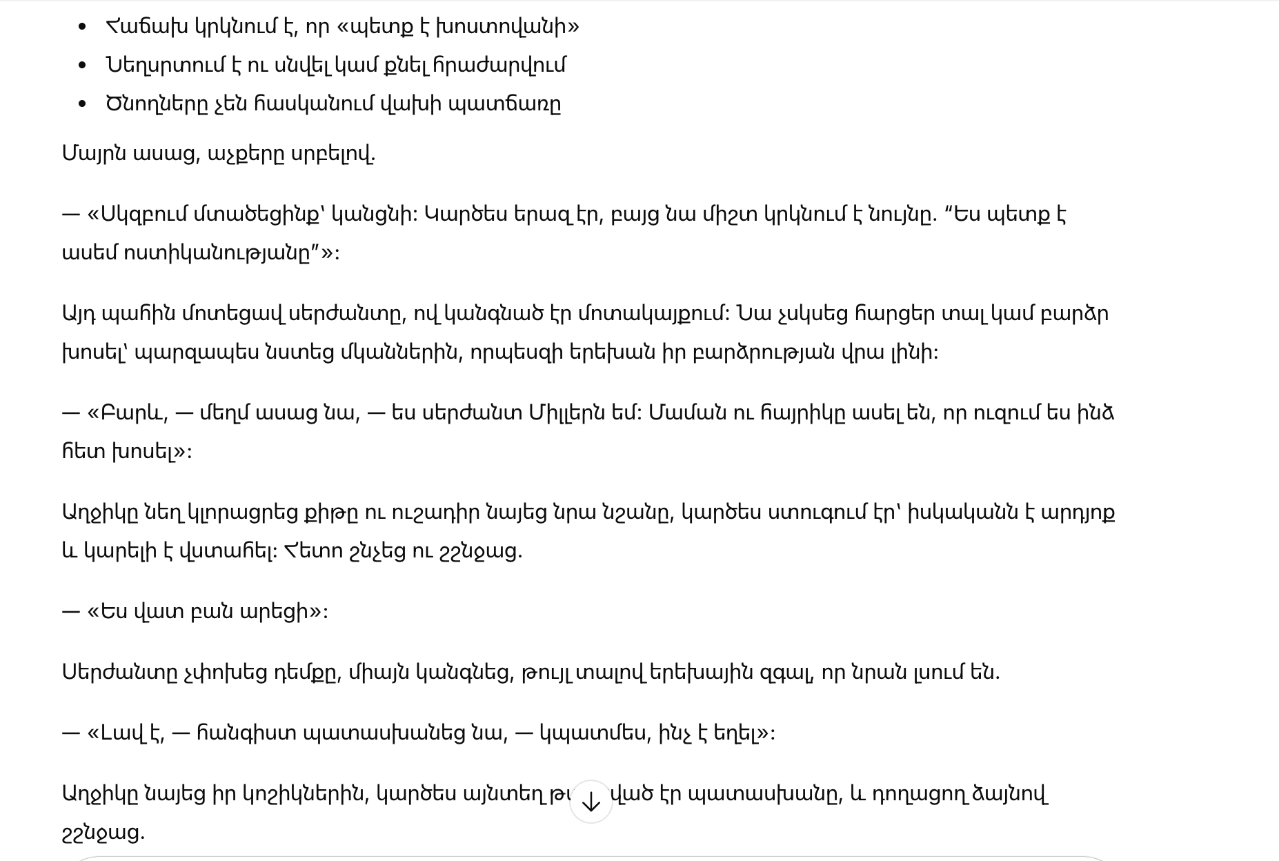 Мужчина выдохнул — так, как выдыхают перед тем, как начать говорить о странной, почти невероятной вещи. «Наша дочь не перестаёт плакать уже три дня. Она повторяет, что должна поговорить с полицейским. Что ей надо признаться. Она плохо ест, почти не спит… и не объясняет нам, что именно, по её мнению, натворила».