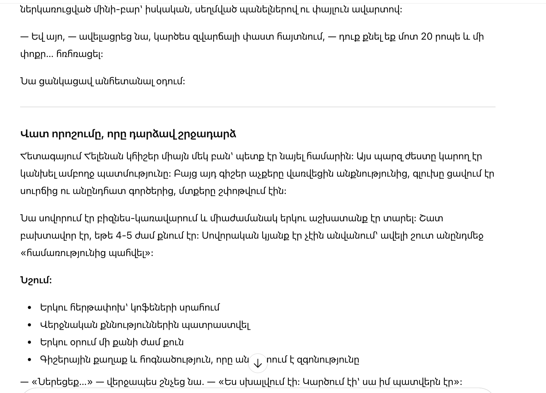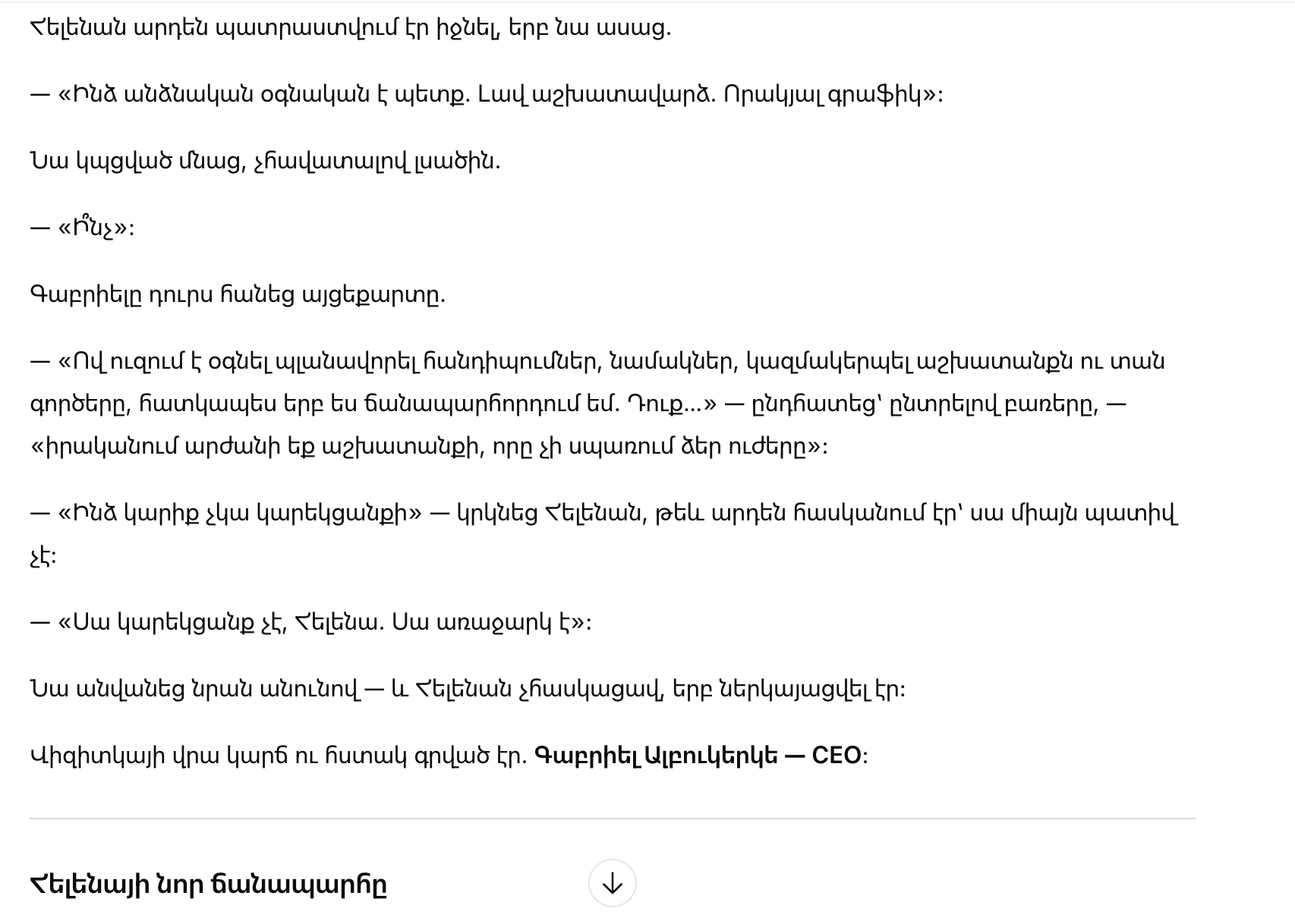 Они обсудили обязанности: планирование встреч, переписку, согласование поездок, организацию бытовых вопросов во время его отсутствия. Цифра зарплаты заставила её на секунду потерять дар речи — она была в несколько раз выше того, что Хелена получала, совмещая две работы.
