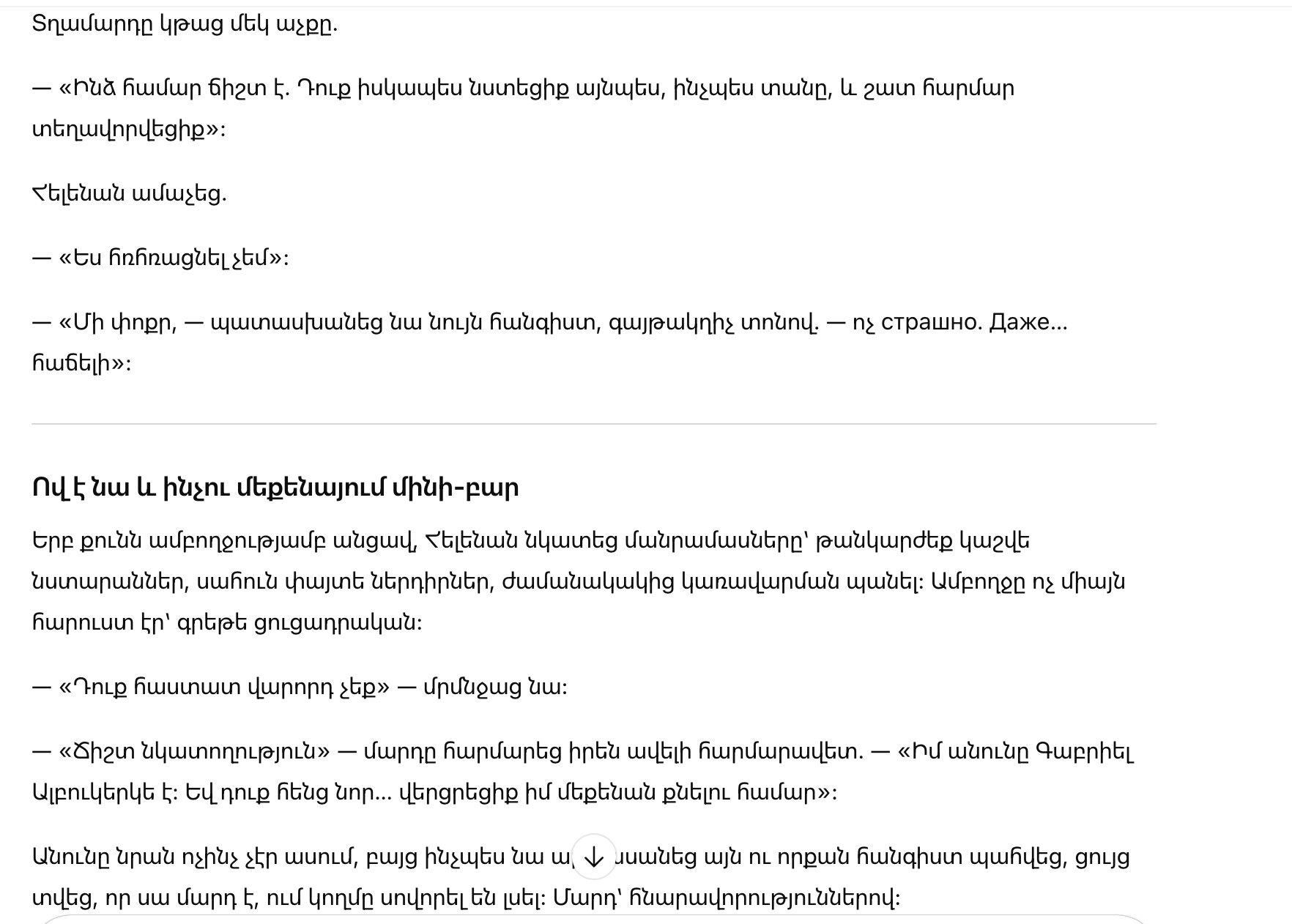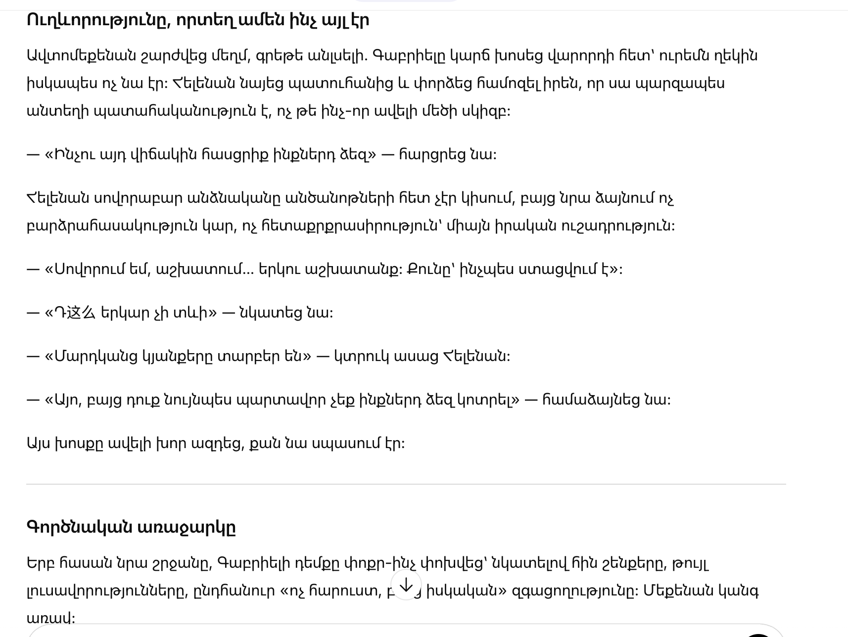 Когда они подъехали к её району, лицо Габриэля слегка изменилось: он заметил старые дома, тусклые фонари и общее ощущение «небогато, но по-настоящему». Машина остановилась у подъезда.