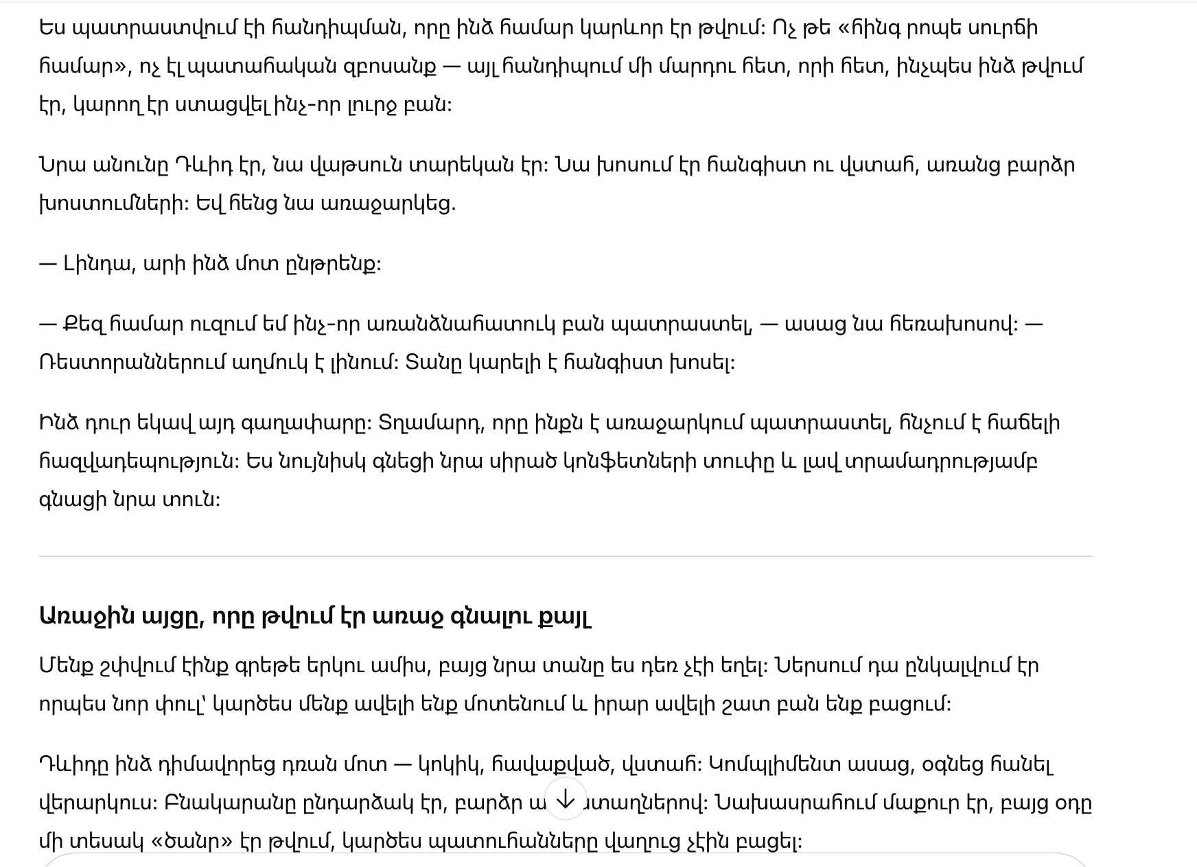 Его звали Дэвид, ему было шестьдесят. Он умел говорить спокойно и уверенно, без громких обещаний. И именно он предложил: «Давай поужинаем у меня дома».