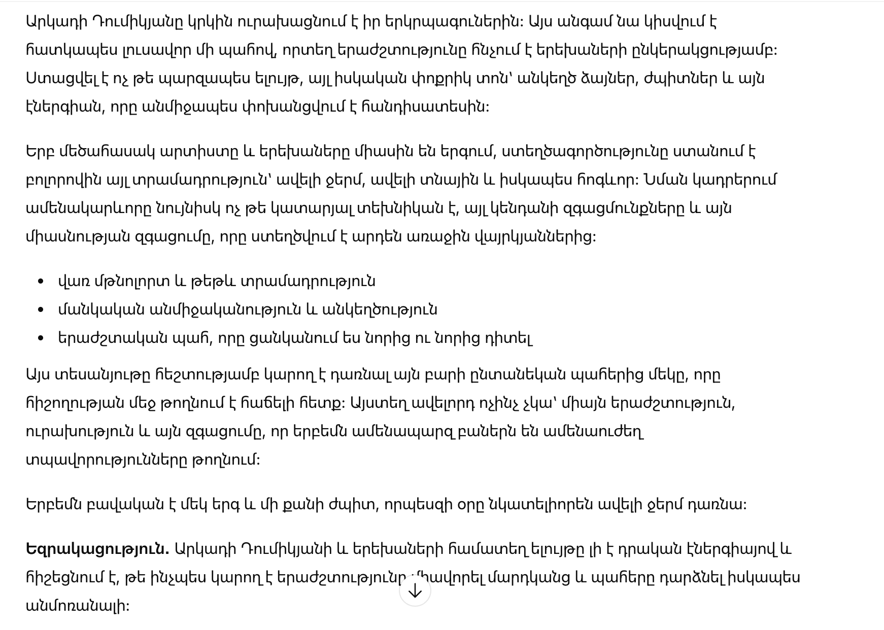 Итог: совместное выступление Аркадия Думикяна с детьми — это заряженный позитивом эпизод, который напоминает, как музыка объединяет и делает моменты по-настоящему незабываемыми.