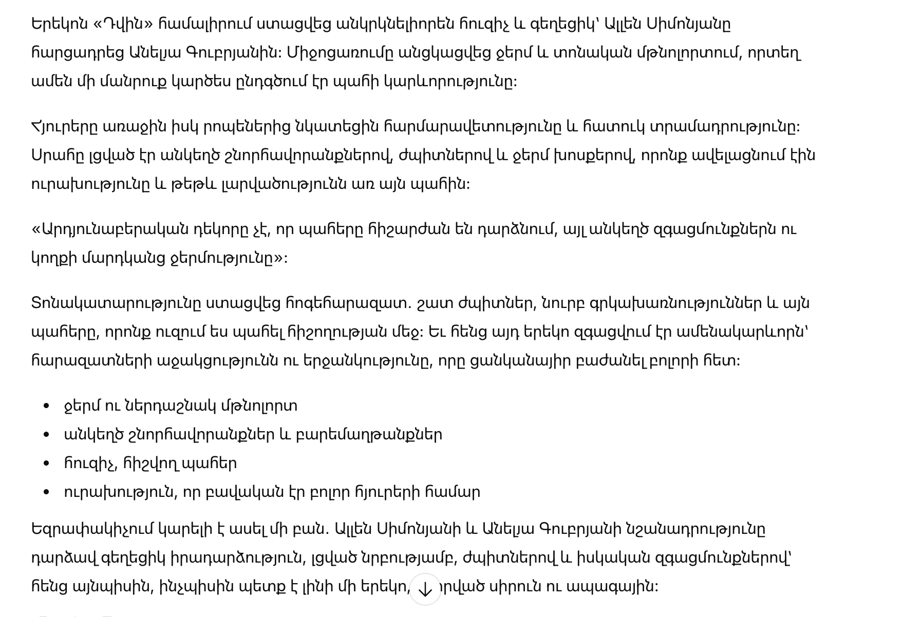 В завершение можно сказать одно: помолвка Аллена Симоняна и Анельи Губрян стала красивым событием, наполненным нежностью, улыбками и настоящими чувствами — именно таким, каким и должен быть вечер, посвящённый любви и будущему.