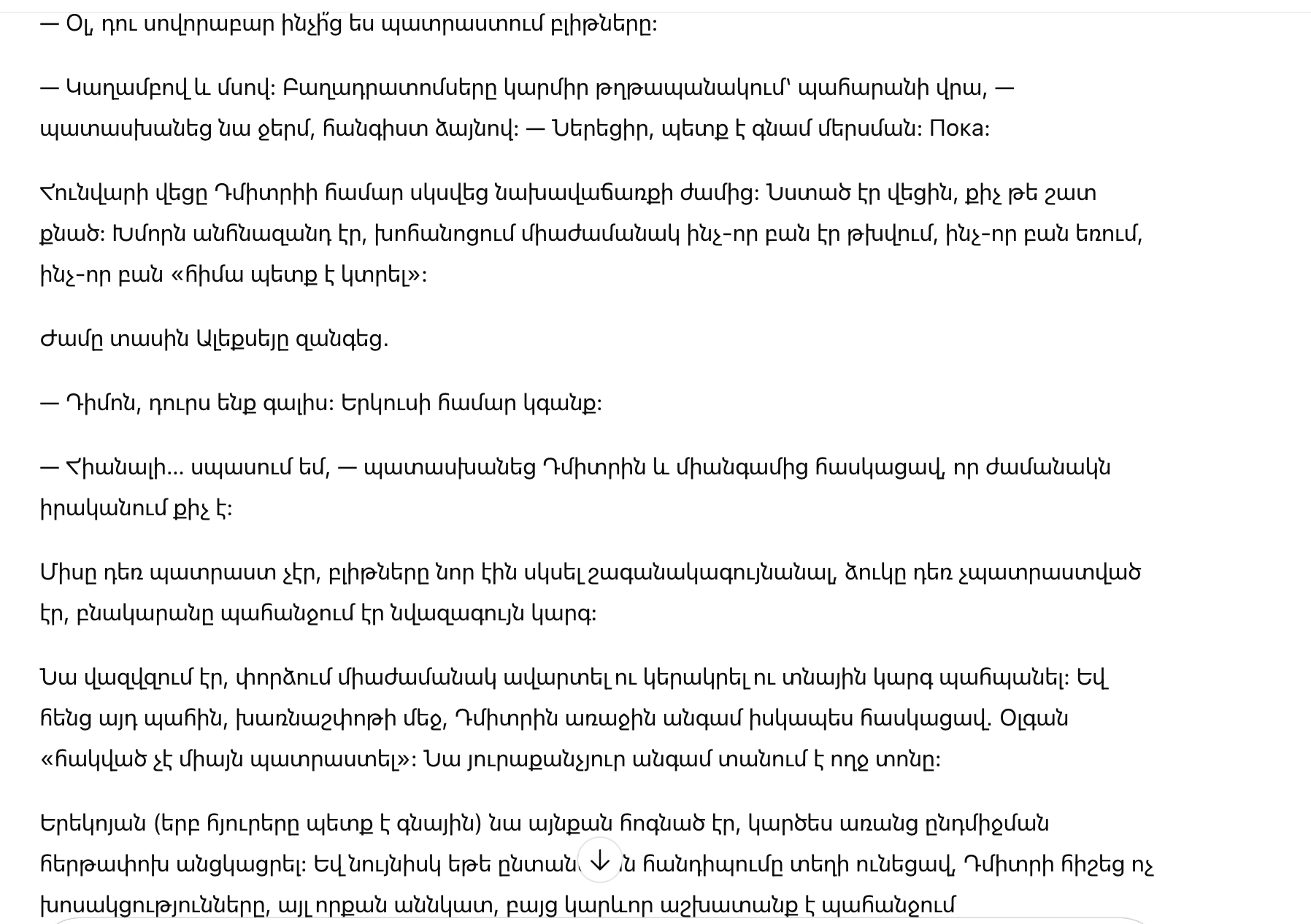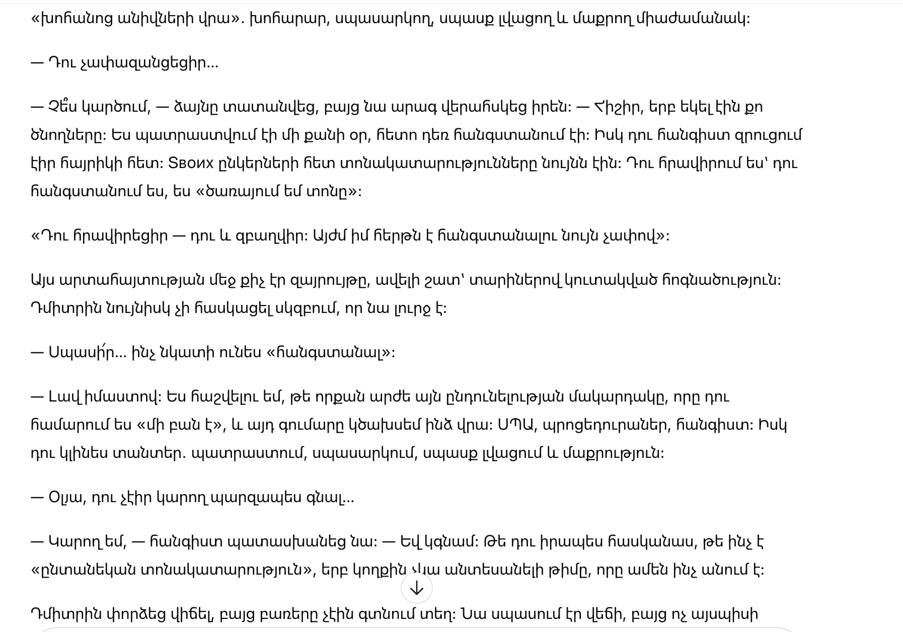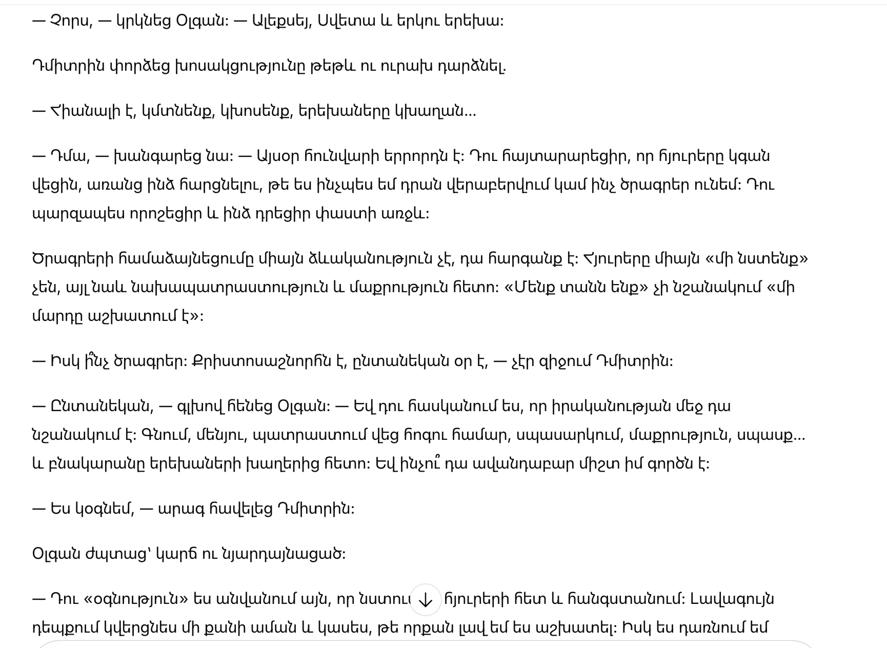 — Ты называешь «помощью» то, что ты сидишь с гостями и отдыхаешь. В лучшем случае унесёшь пару тарелок и скажешь, какая я молодец. А я превращаюсь в кухню на колёсах: повар, официант, посудомойка и уборщица одновременно.