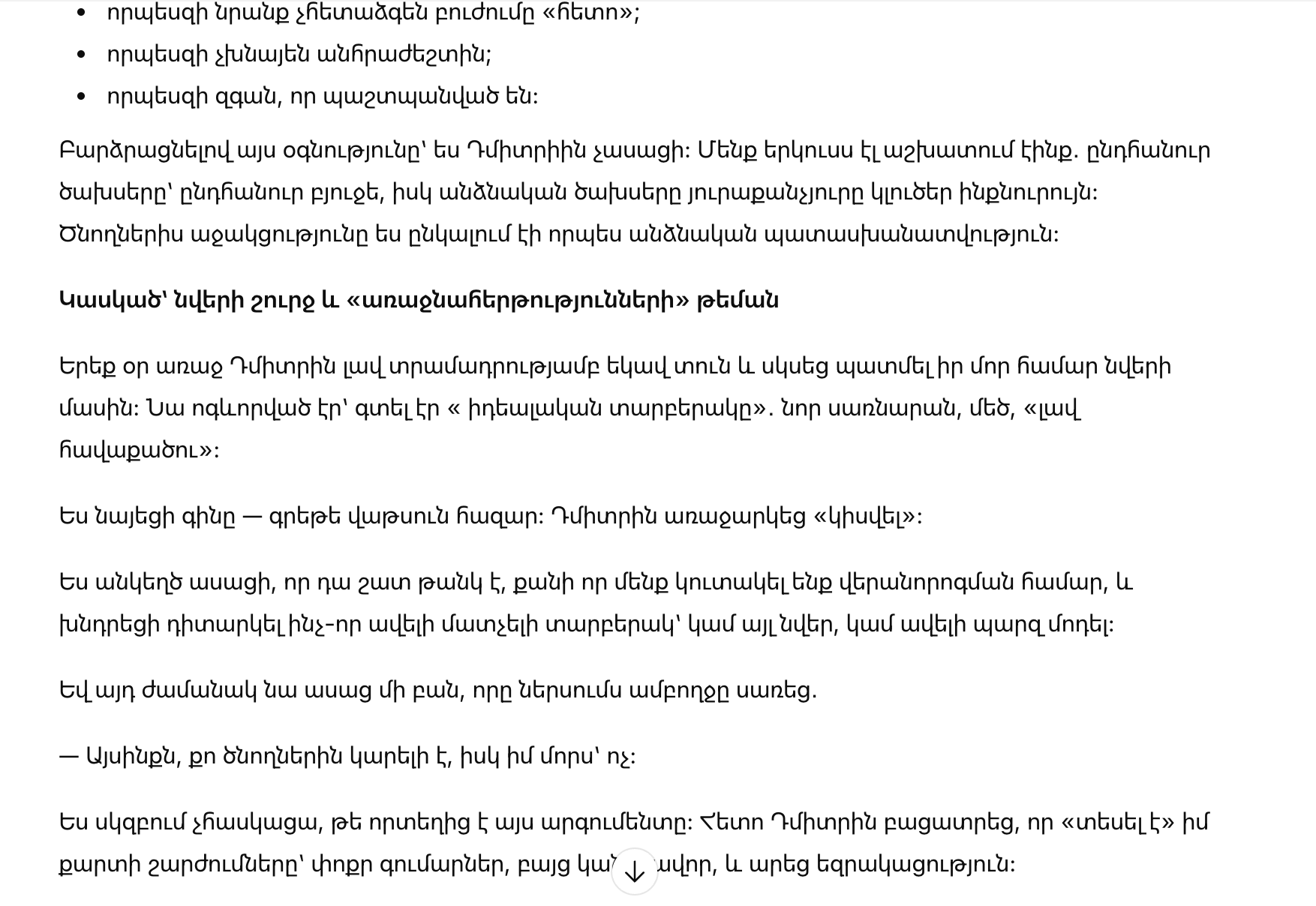 Я не оправдывалась: да, я помогаю родителям. Но сравнивать лекарства пожилым людям и дорогой подарок — это, по‑моему, разные категории. Дмитрий же перевёл разговор в соревнование, кому «досталось больше внимания», и обиделся так, будто я совершила предательство.
