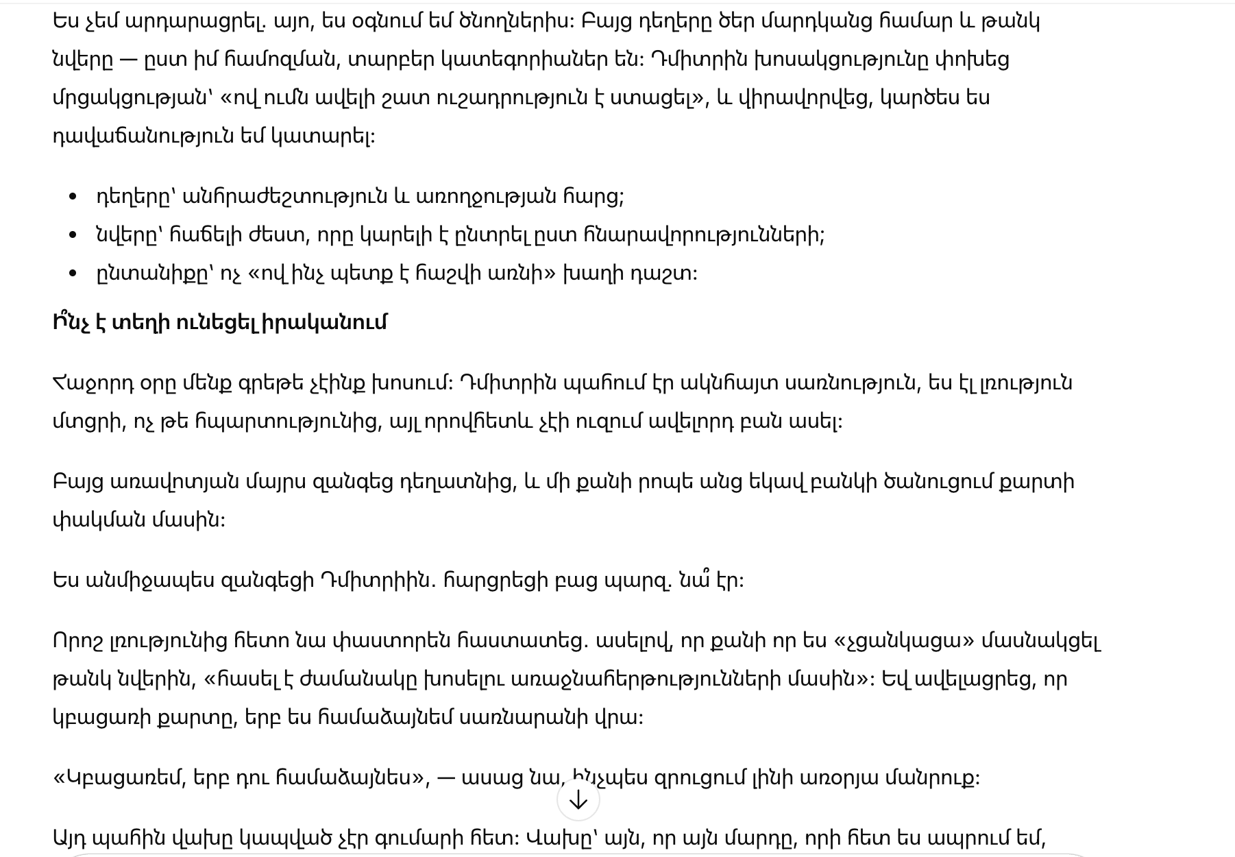 Я объяснила, что проблема не в самой ссоре и не в холодильнике. Проблема в способе, которым он решил добиться своего. И в том, что он залез в мою финансовую жизнь без разрешения.