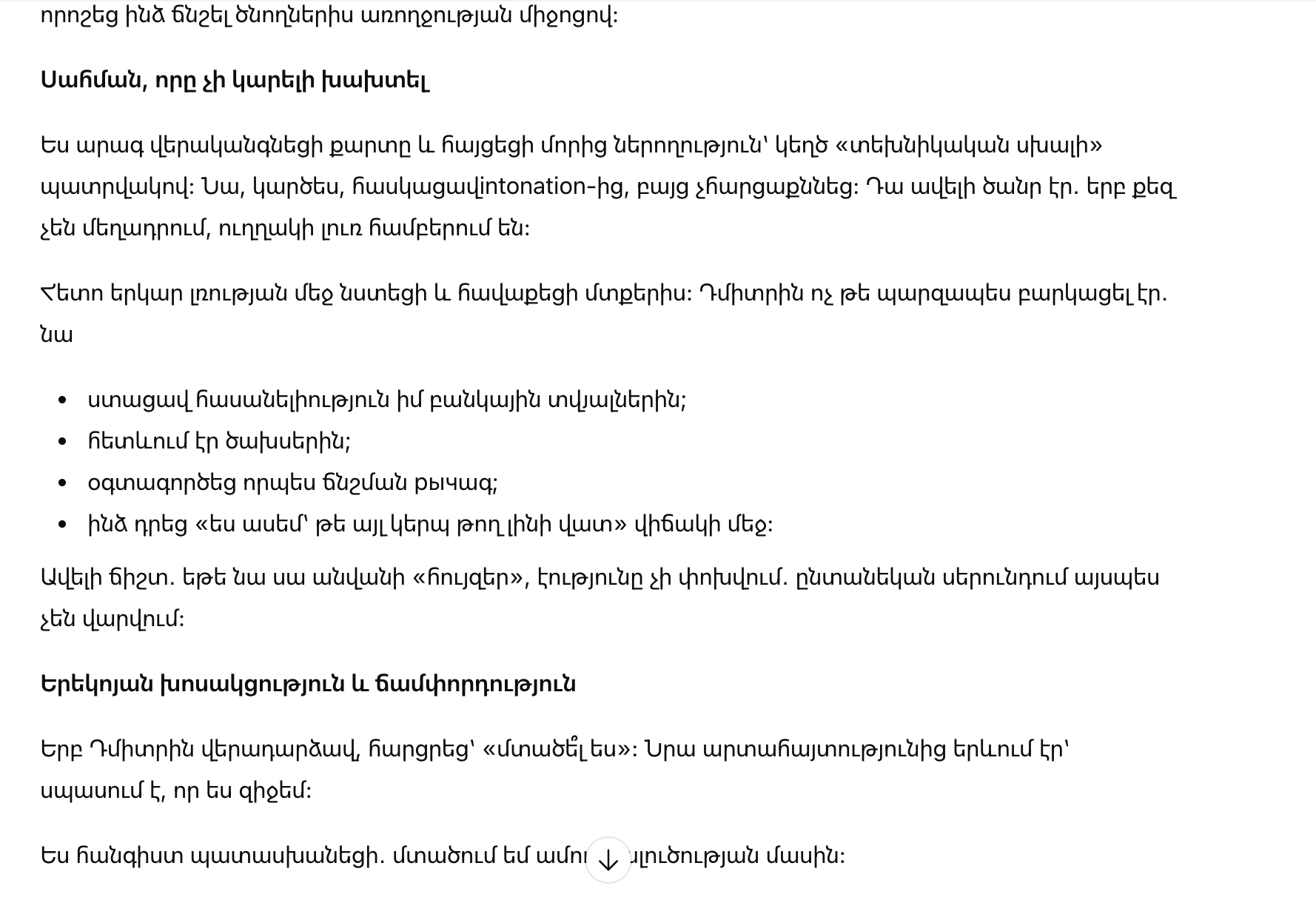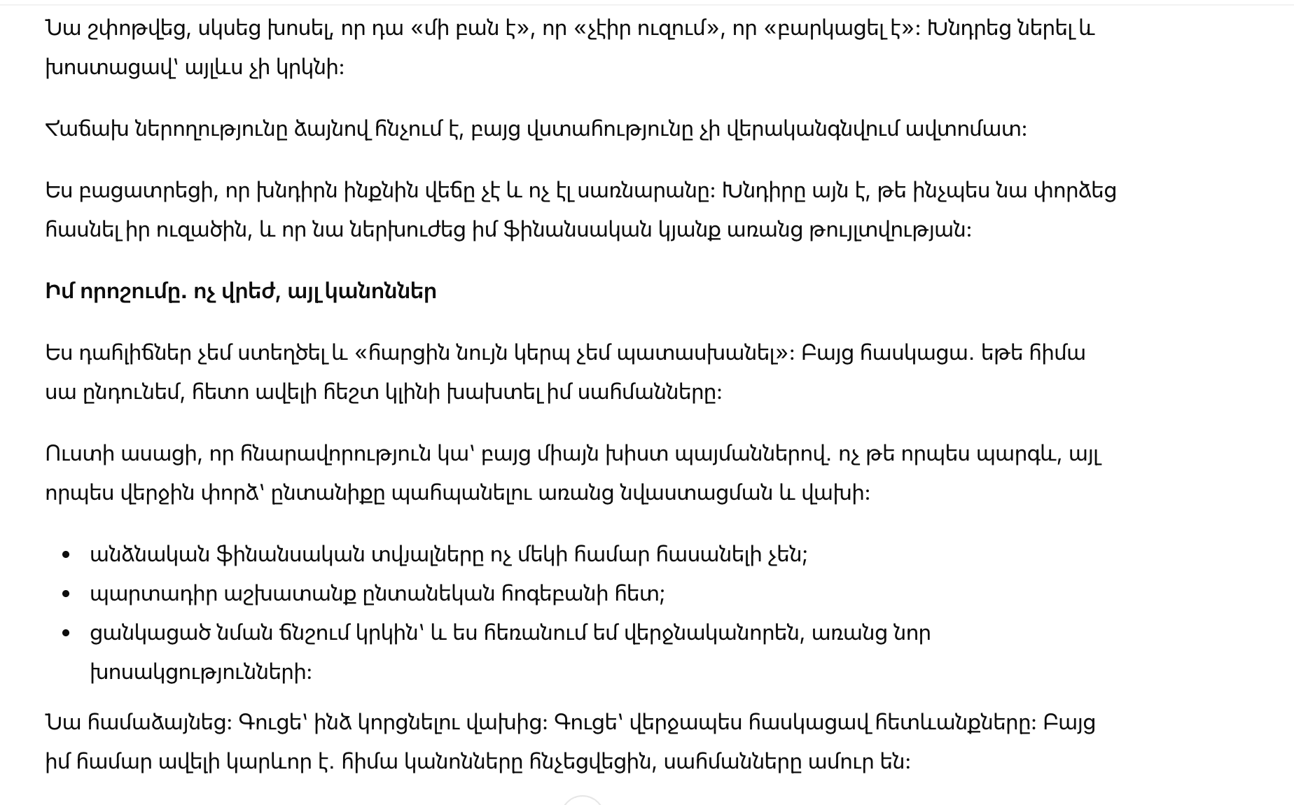 Он согласился. Возможно, из страха меня потерять. Возможно, потому что наконец понял последствия. Но для меня важнее другое: теперь правила обозначены вслух, а границы стоят на месте.