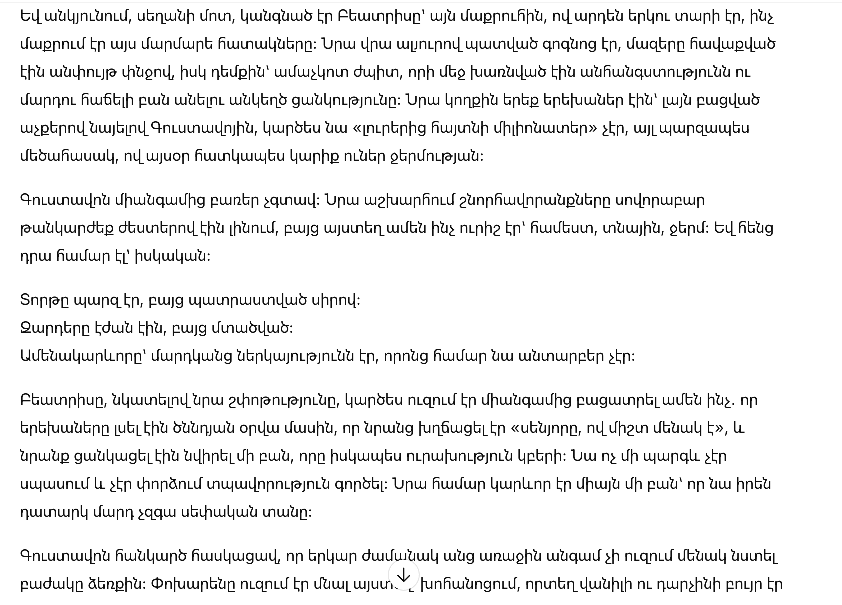 Беатрис, заметив его растерянность, будто захотела объяснить всё разом — что дети услышали о дне рождения, что им стало жалко «сеньора, который всегда один», что им хотелось подарить нечто настоящее. Она не просила награды и не пыталась произвести впечатление. Ей было важно другое: чтобы он почувствовал себя не пустым местом в собственном доме.