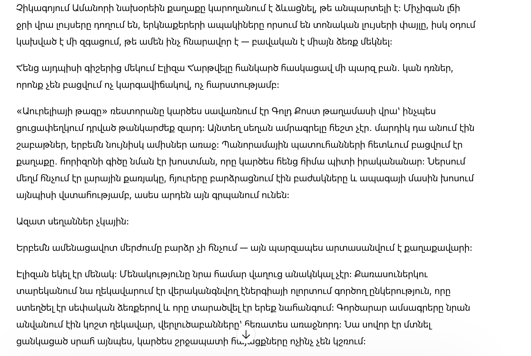 Элиза пришла одна. Одиночество давно перестало быть для неё неожиданностью. В сорок два она возглавляла компанию в сфере возобновляемой энергетики, построенную собственными руками и раскинувшуюся на три штата. Деловые журналы называли её жёсткой, аналитики — дальновидной. Она привыкла входить в любые залы так, будто взгляды окружающих ничего не весят.