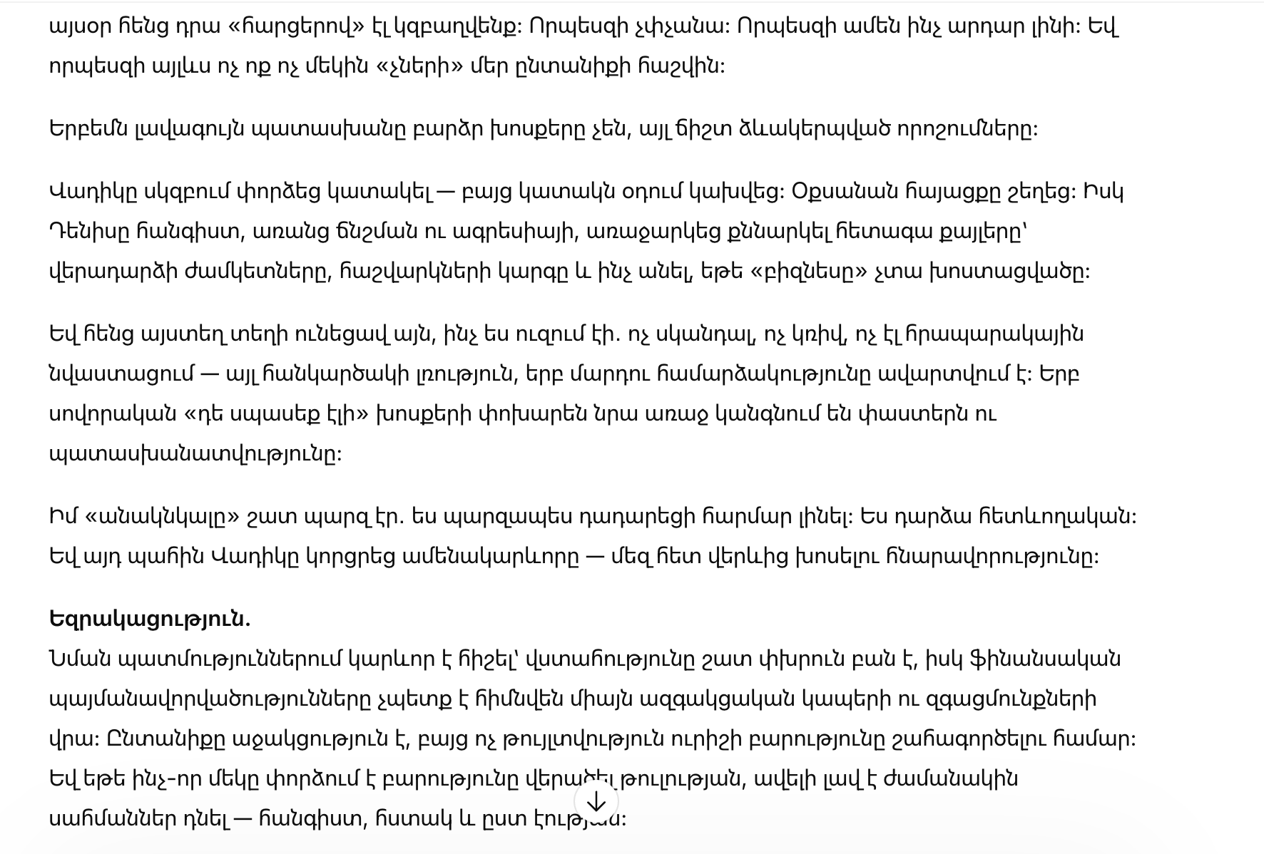 Вадик сначала попытался пошутить — но шутка повисла в воздухе. Оксана отвела глаза. А Денис спокойно, без давления и агрессии, предложил обсудить дальнейшие шаги: сроки возврата, порядок расчетов и что делать, если «бизнес» не приносит обещанного.