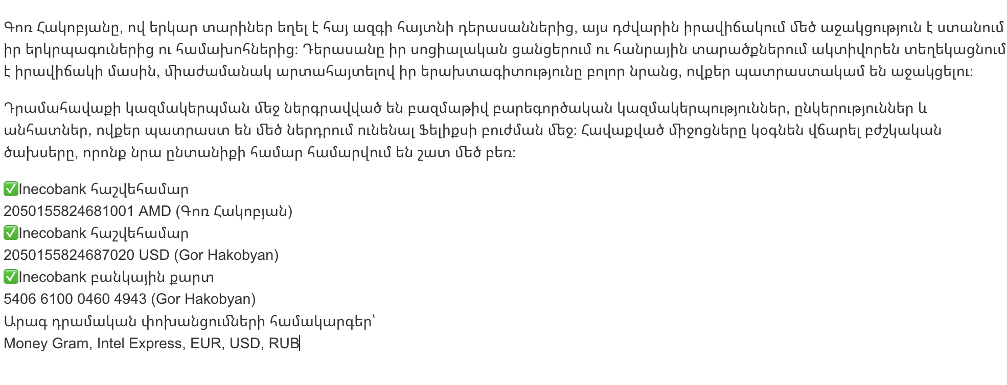 Гор Акобян, много лет являющийся одним из самых известных актеров армянской нации, получает огромную поддержку от своих поклонников и сторонников в этой сложной ситуации. Актер активно освещает ситуацию в своих социальных сетях и на публичных площадках, выражая благодарность всем, кто готов его поддержать.