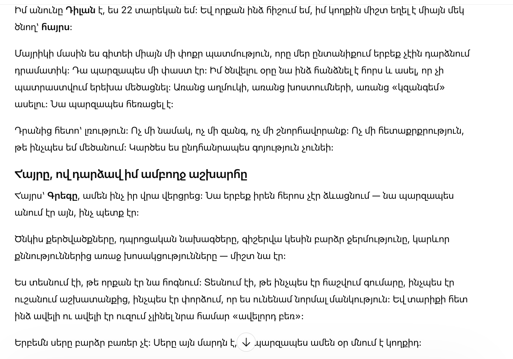 Я видел, как он устаёт. Видел, как считает деньги, как задерживается на работе, как старается, чтобы у меня было нормальное детство. И с возрастом мне всё сильнее хотелось не быть для него «ещё одной нагрузкой».
