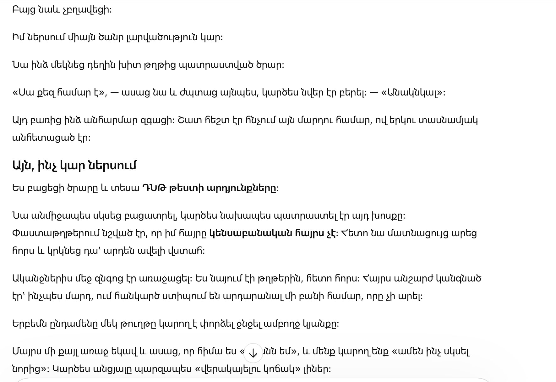 Она тут же объяснила, будто готовилась к этой речи заранее: по документам выходило, что мой отец — не мой биологический родитель. Затем она указала на папу и повторила это ещё раз, уже более уверенно.