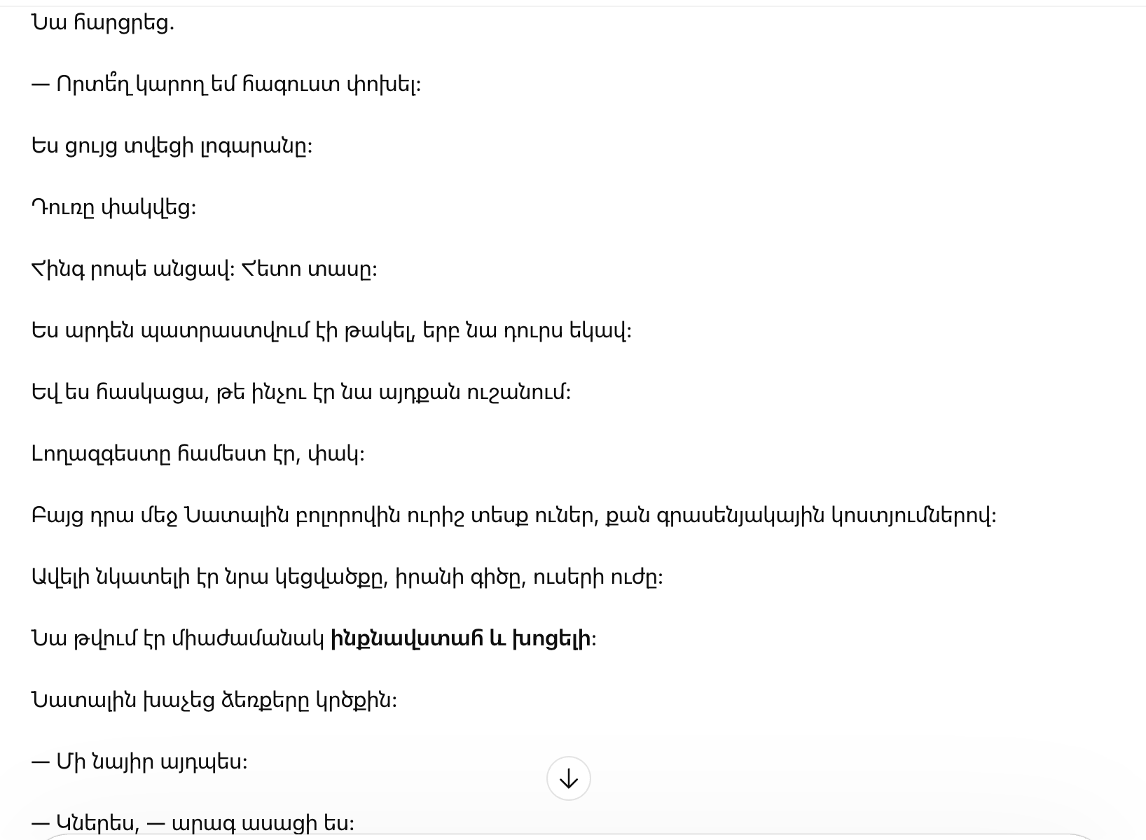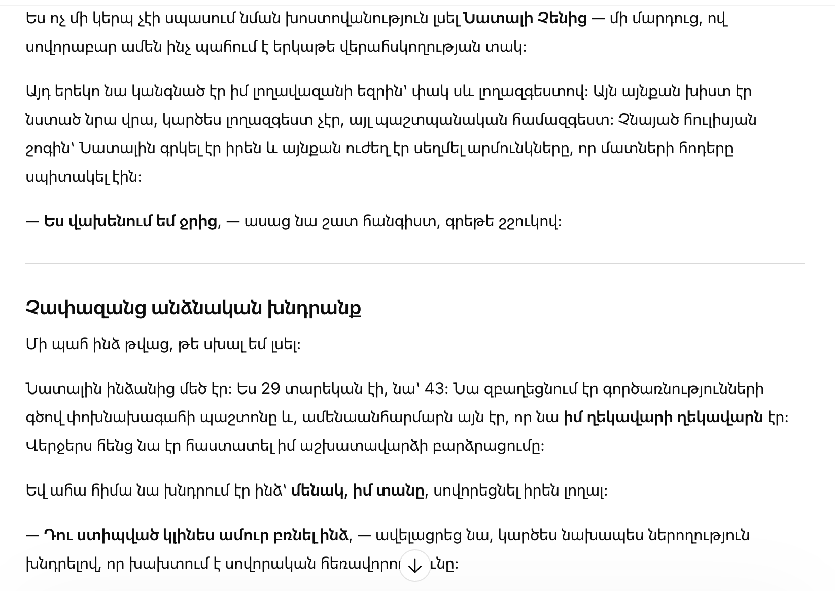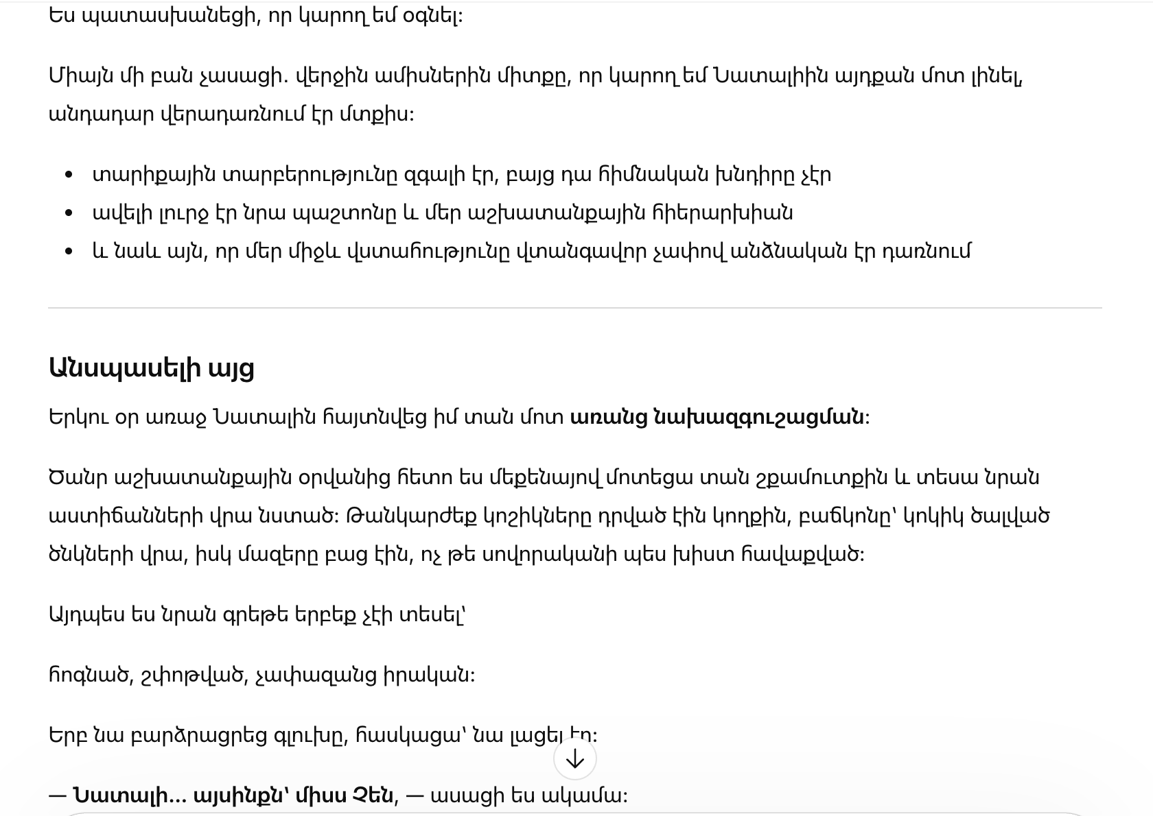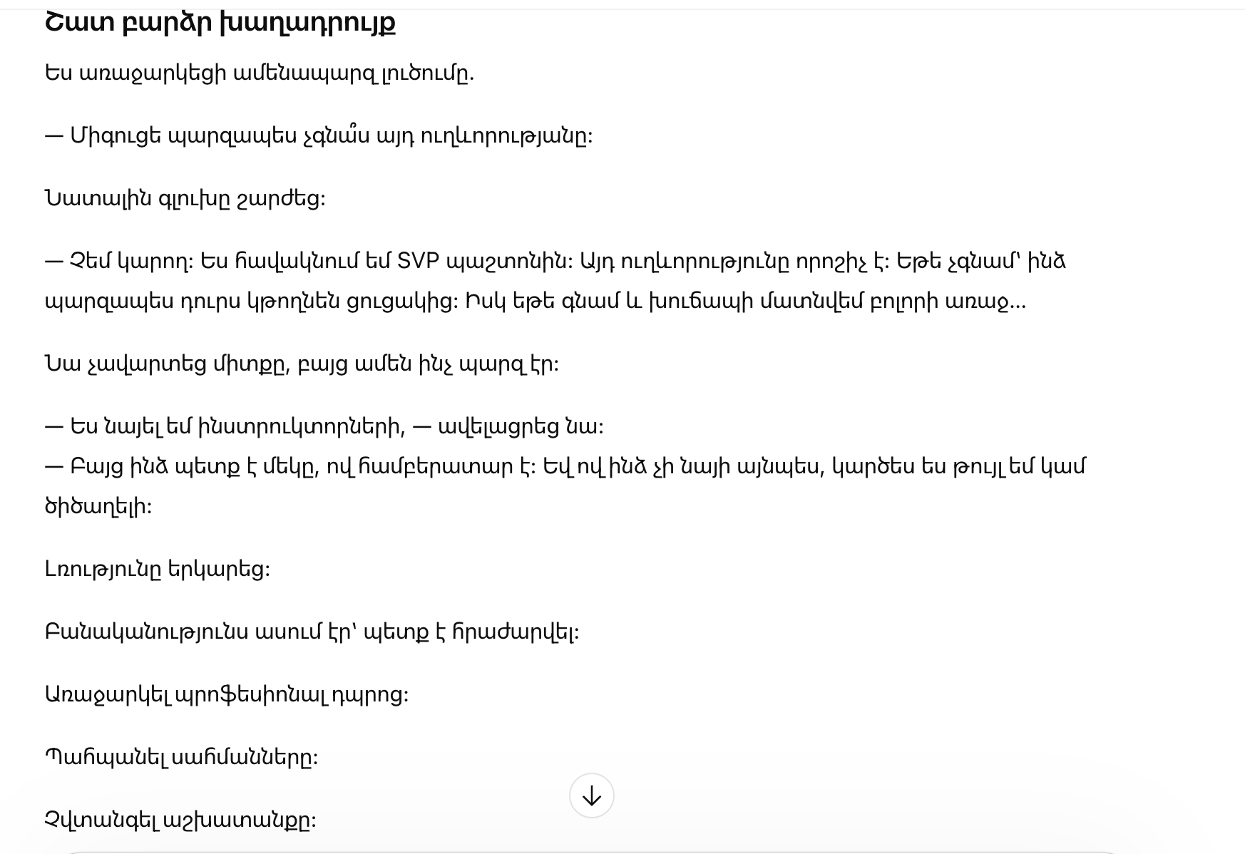 Мы замолчали. В её взгляде мелькнуло что-то новое — не рабочее, не холодное. Она прочистила горло и, словно спасаясь деловым тоном, сказала: