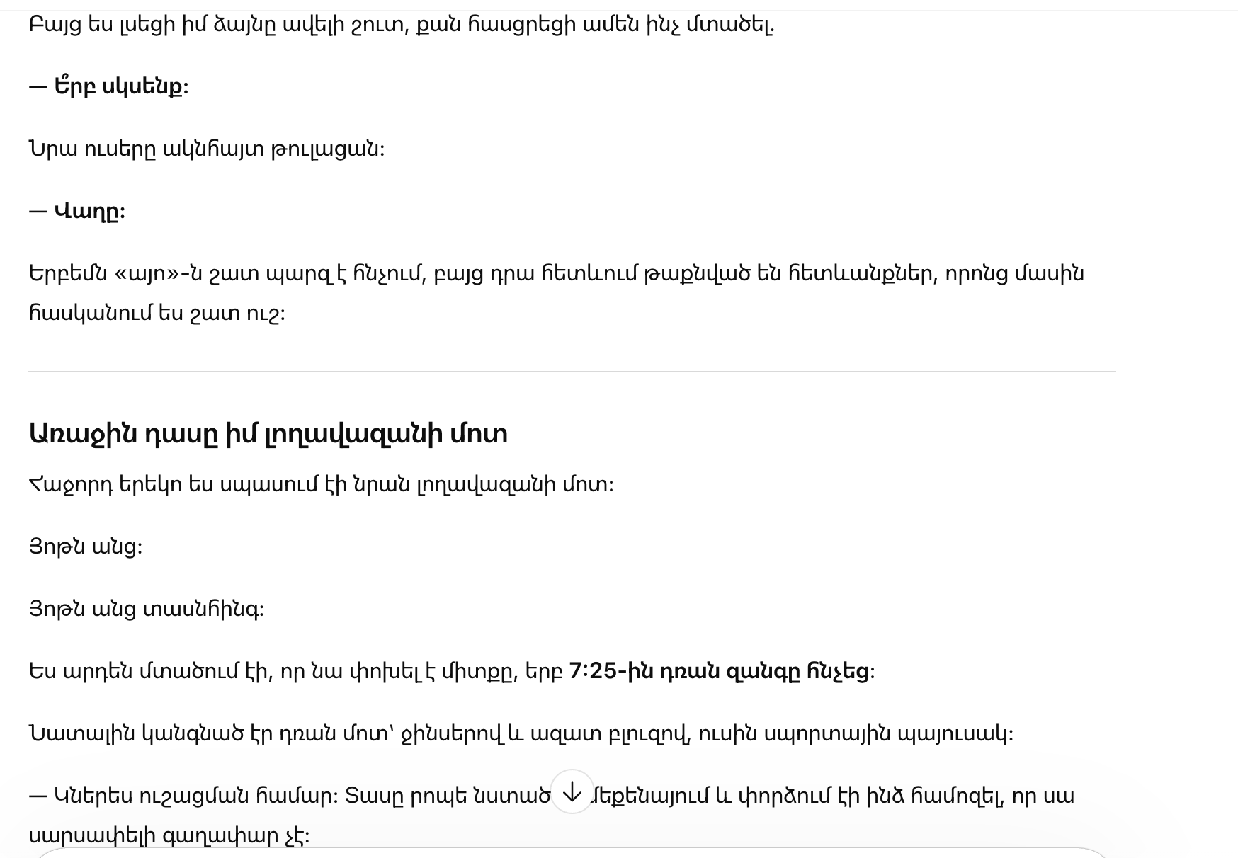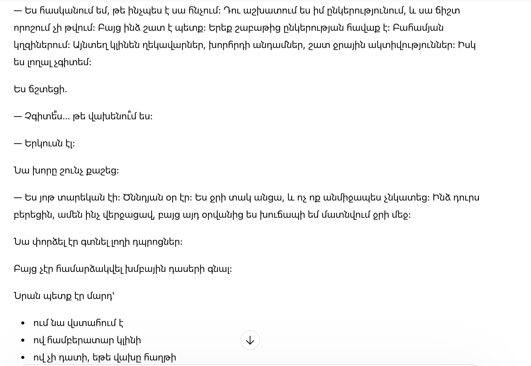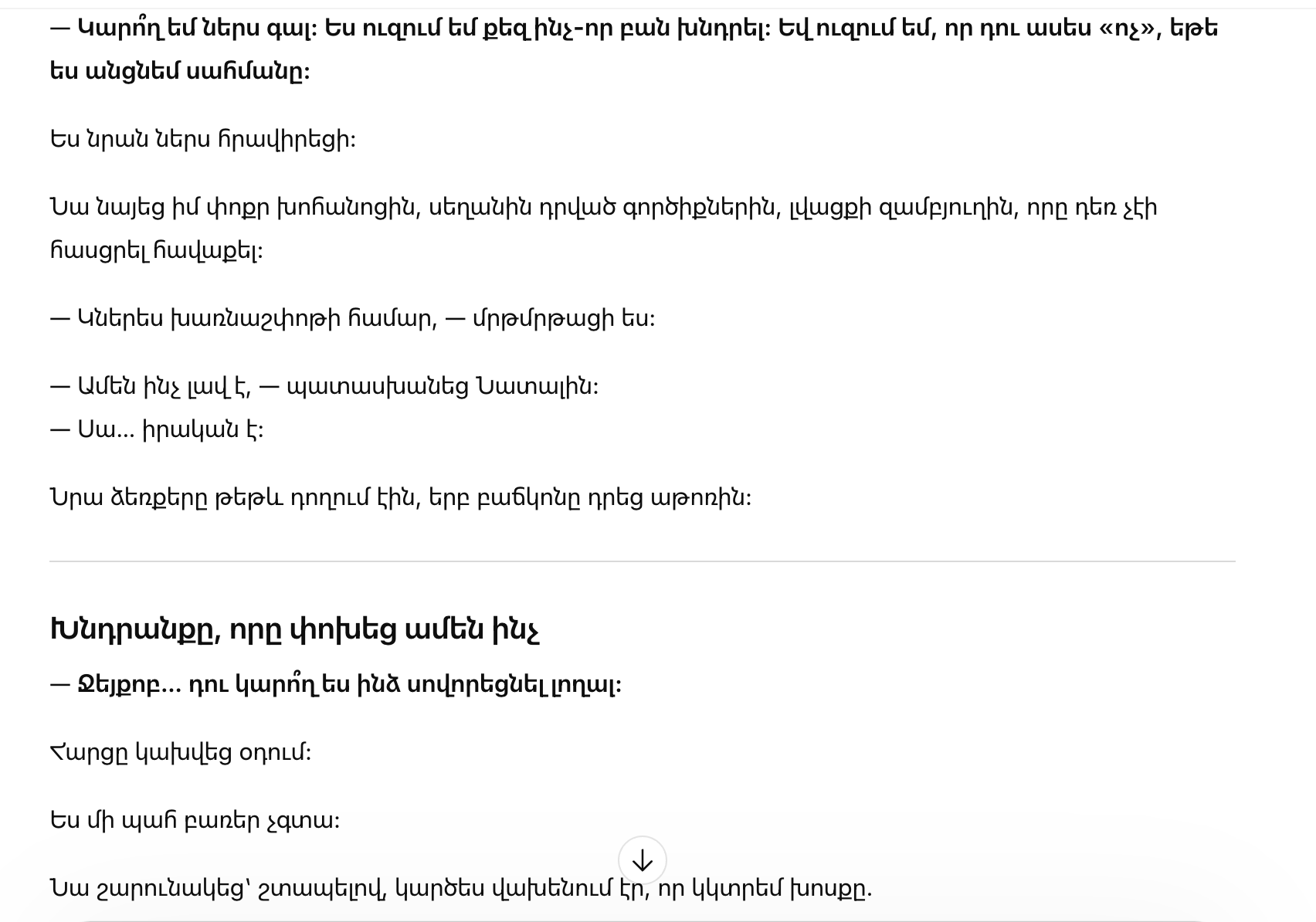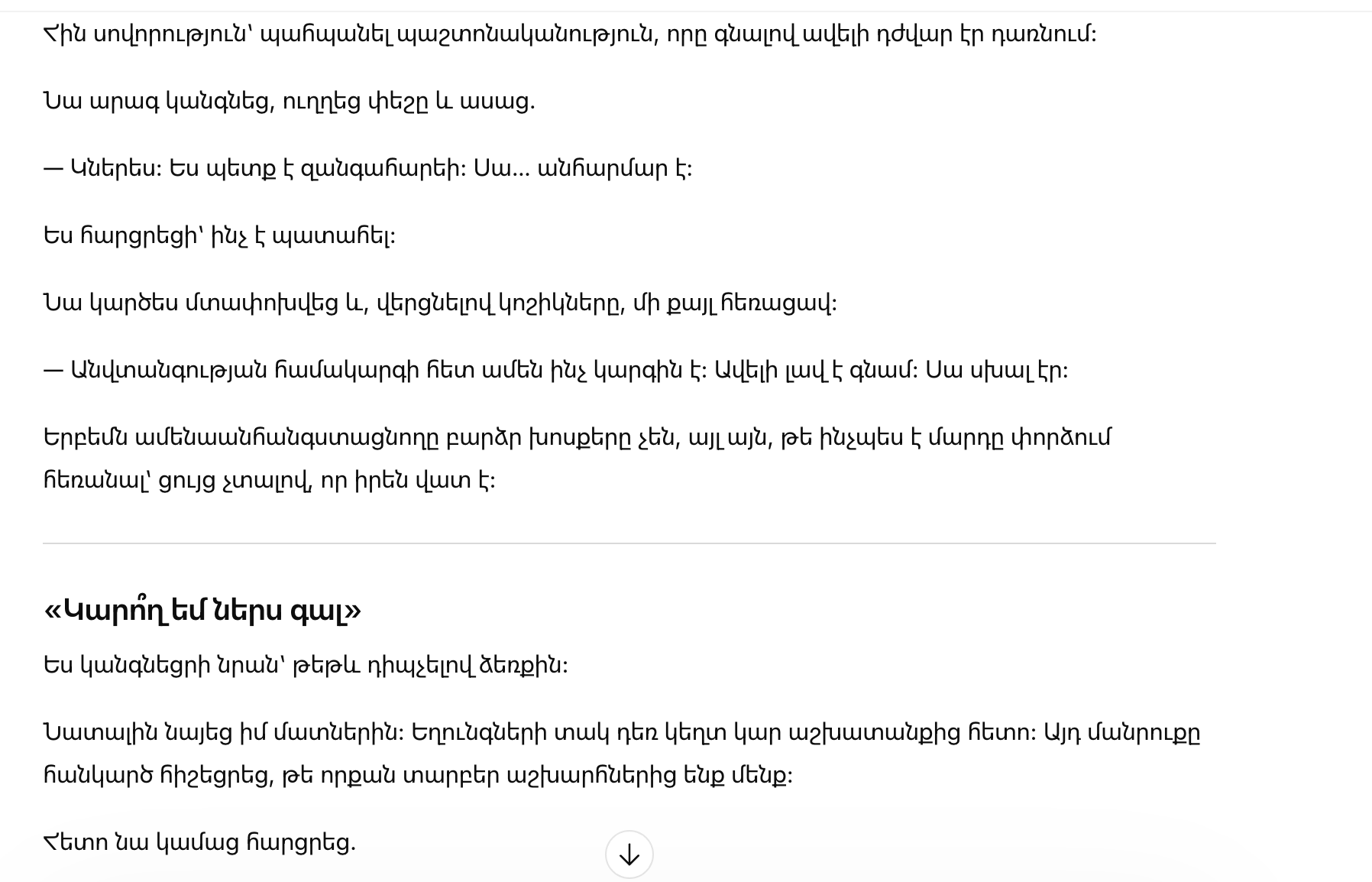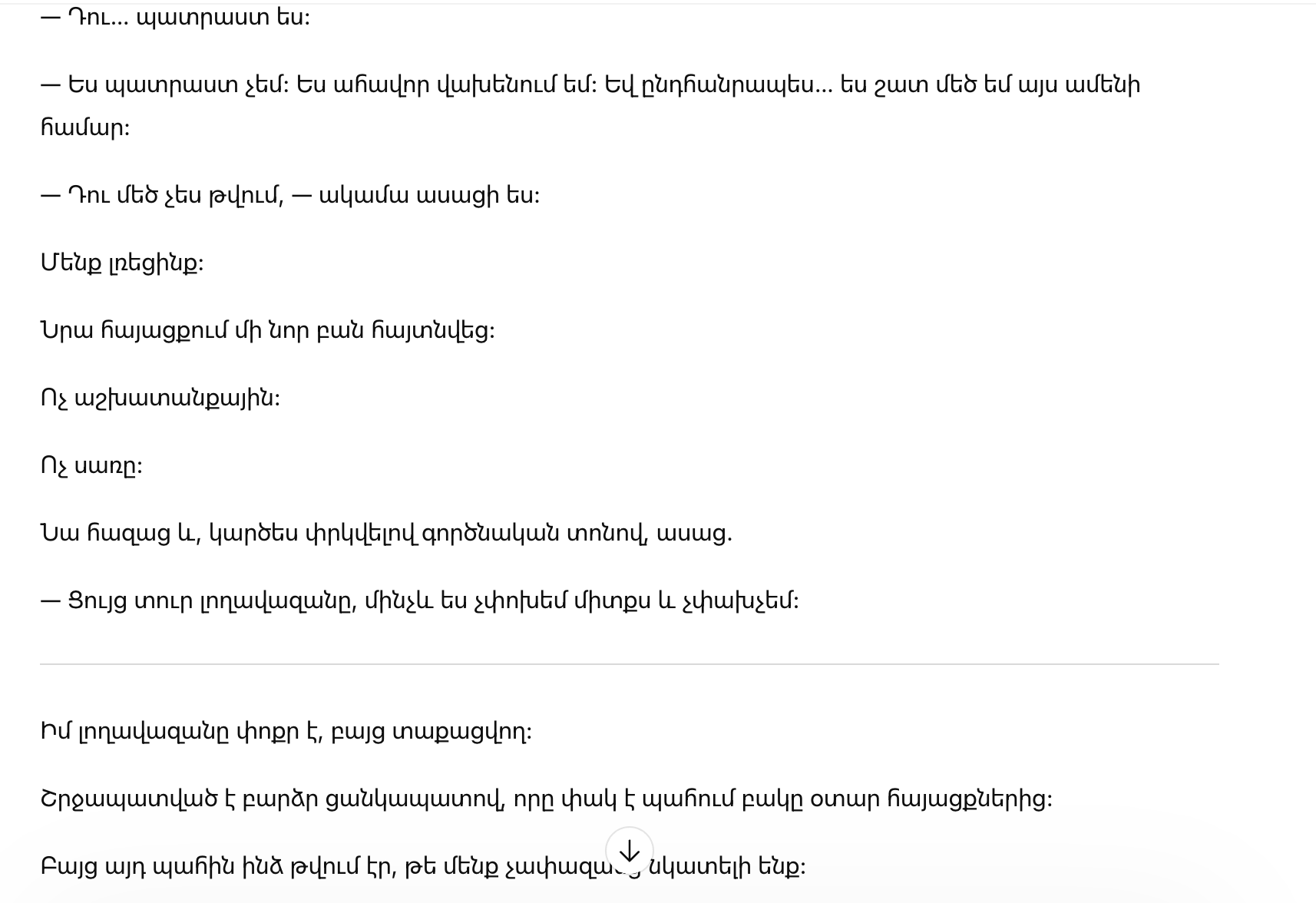 Мы замолчали. В её взгляде мелькнуло что-то новое — не рабочее, не холодное. Она прочистила горло и, словно спасаясь деловым тоном, сказала: