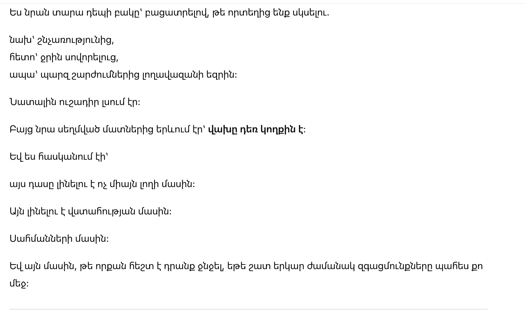 Я повёл её на задний двор, объясняя, с чего начнём: с дыхания, с привыкания к воде и с простых движений у бортика. Натали слушала внимательно, но по тому, как она сжимала пальцы, было видно — страх ещё рядом. И я понимал: этот урок будет не только о плавании. Он будет о доверии. О границах. И о том, как легко их размыть, если слишком долго держать чувства при себе.