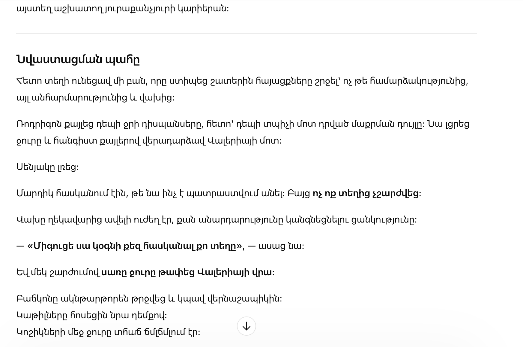 Дальше случилось то, что заставило многих отвести глаза — не из смелости, а от неловкости и страха. Родриго прошёл к кулеру, затем к принтеру, где стояло ведро для уборки, набрал воду и, не торопясь, вернулся к Валерии.