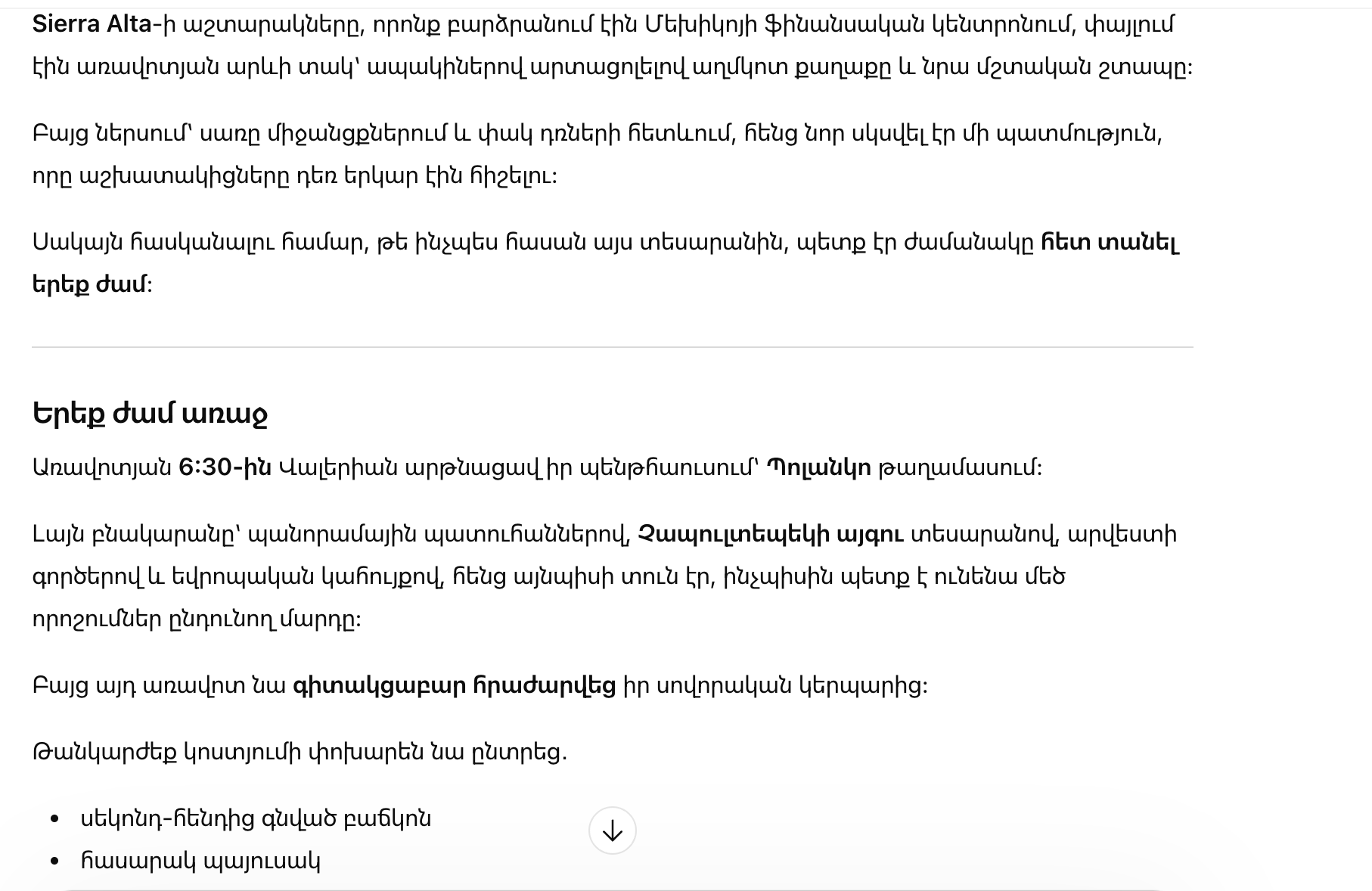 В 6:30 утра Валерия проснулась в пентхаусе в районе Поланко. Просторная квартира с панорамными окнами, видом на парк Чапультепек, произведениями искусства и европейской мебелью выглядела так, как и полагается дому человека, привыкшего управлять крупными цифрами и большими решениями.