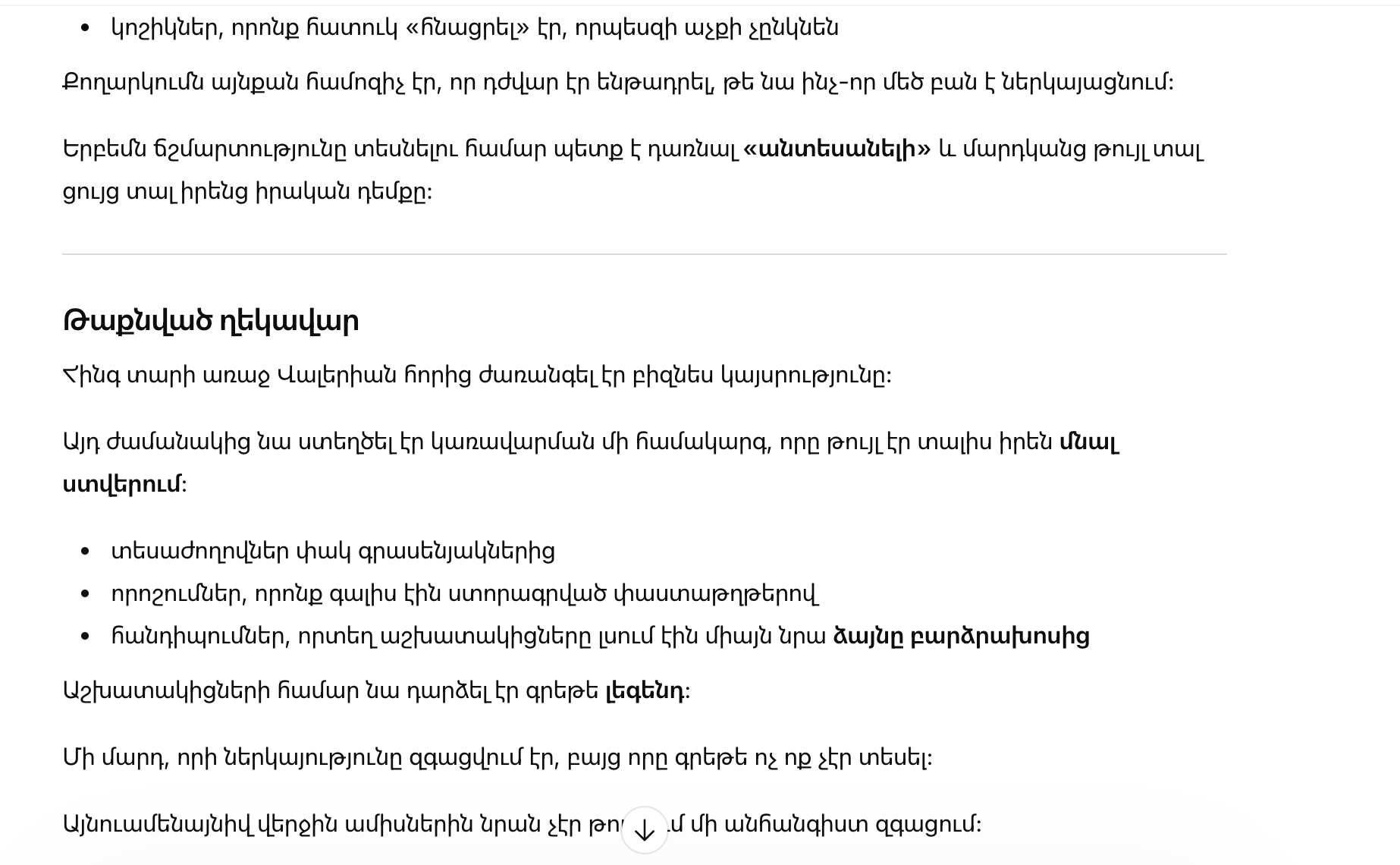 Пять лет назад Валерия унаследовала бизнес-империю от отца. С тех пор она выстроила систему управления так, чтобы оставаться в тени: видеосовещания из закрытых кабинетов, решения, которые приходили в виде подписи на документах, встречи, где сотрудники слышали лишь голос из динамика.