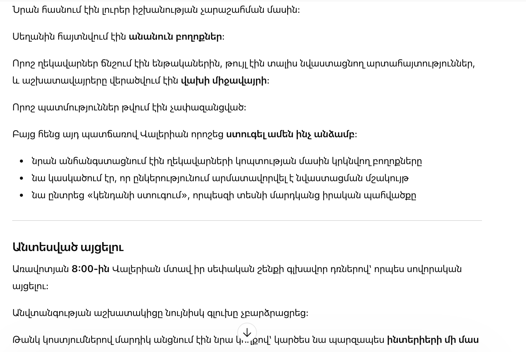 И всё же последние месяцы её не отпускало тревожное чувство. До неё доходили слухи о злоупотреблении властью. На стол ложились анонимные жалобы: руководители среднего звена давили на подчинённых, позволяли себе унизительные высказывания, превращали рабочие места в пространство страха. Некоторые истории казались преувеличенными — слишком жестокими, чтобы быть правдой. Но именно поэтому Валерия решила проверить всё лично.