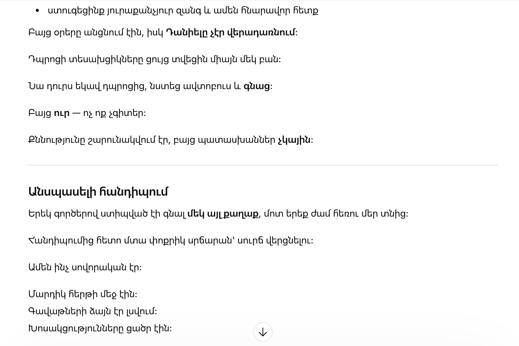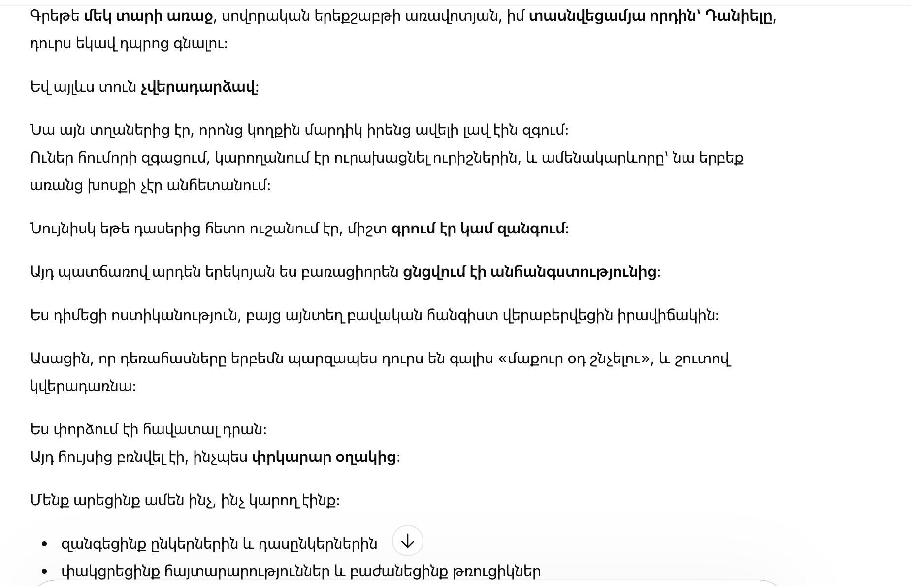 Но дни тянулись, а Даниэль не возвращался. Камеры в школе показали только одно: он вышел с территории, сел в автобус и уехал. Куда именно — никто не знал. Расследование продолжалось, но ответы не появлялись.