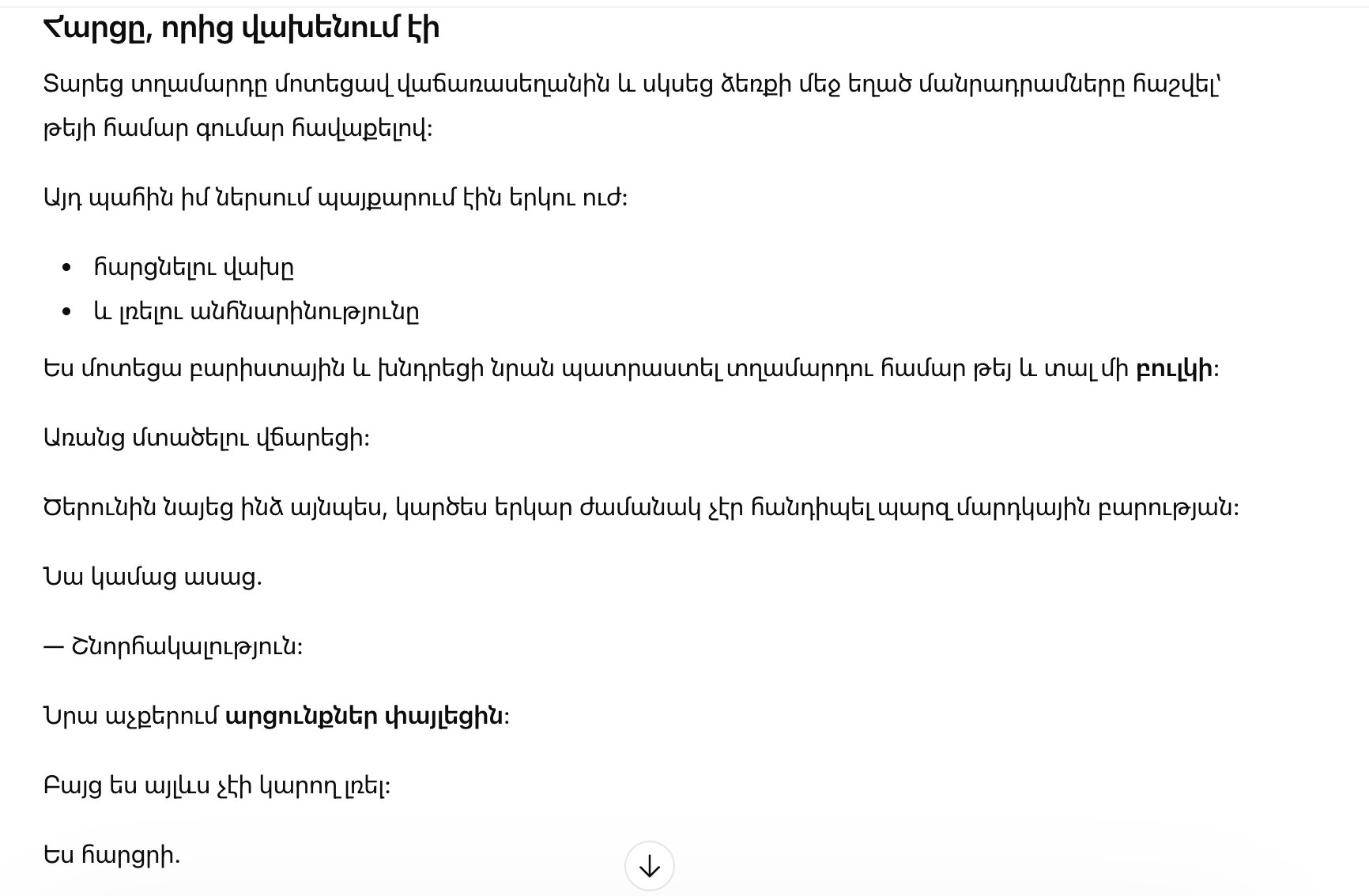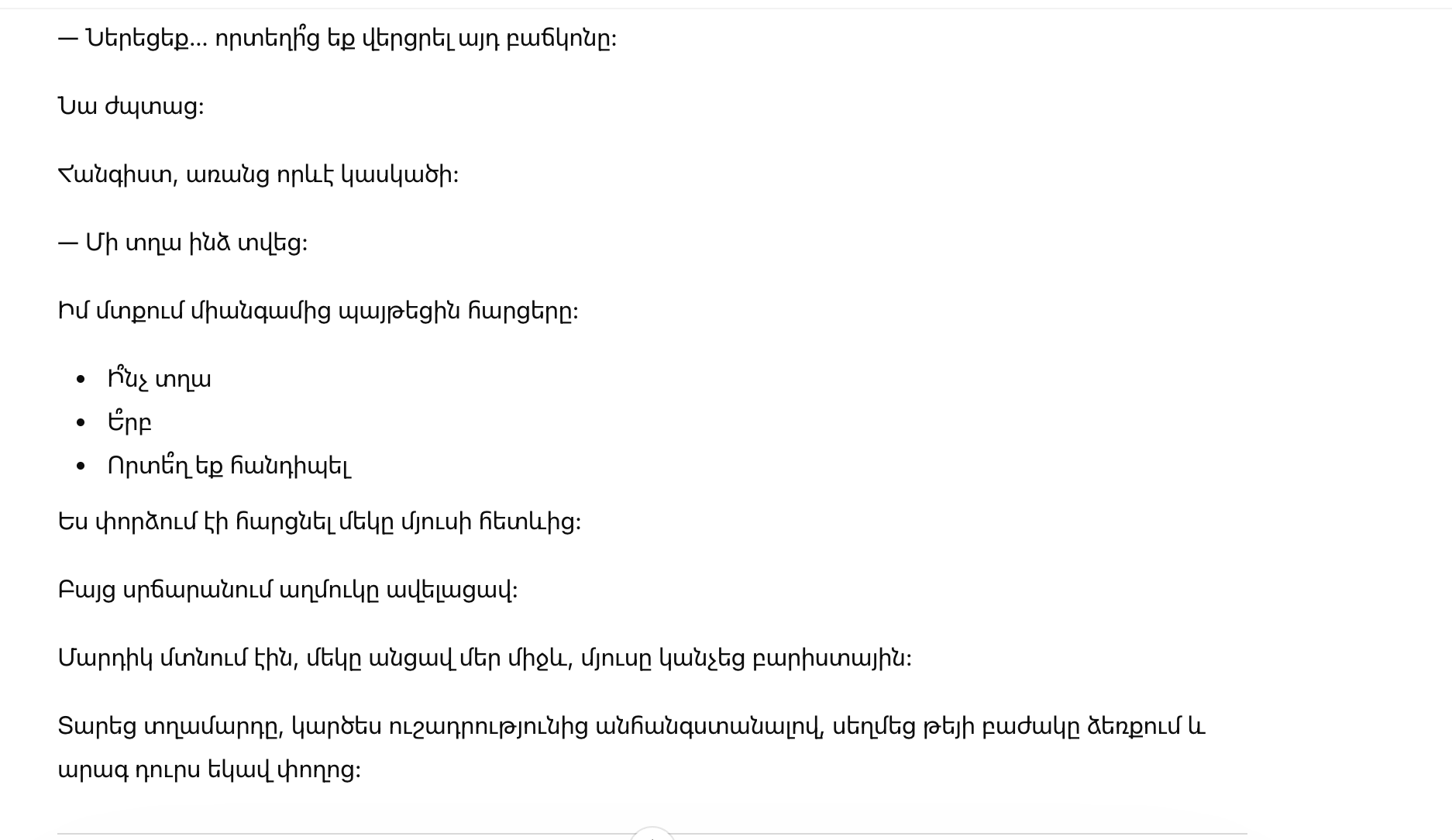 Я пыталась задавать вопросы один за другим, но вокруг стало шумно: в кафе прибавилось людей, кто-то прошёл между нами, кто-то позвал бариста. Пожилой мужчина, словно испугавшись внимания, прижал к себе стакан и быстрым шагом вышел на улицу.