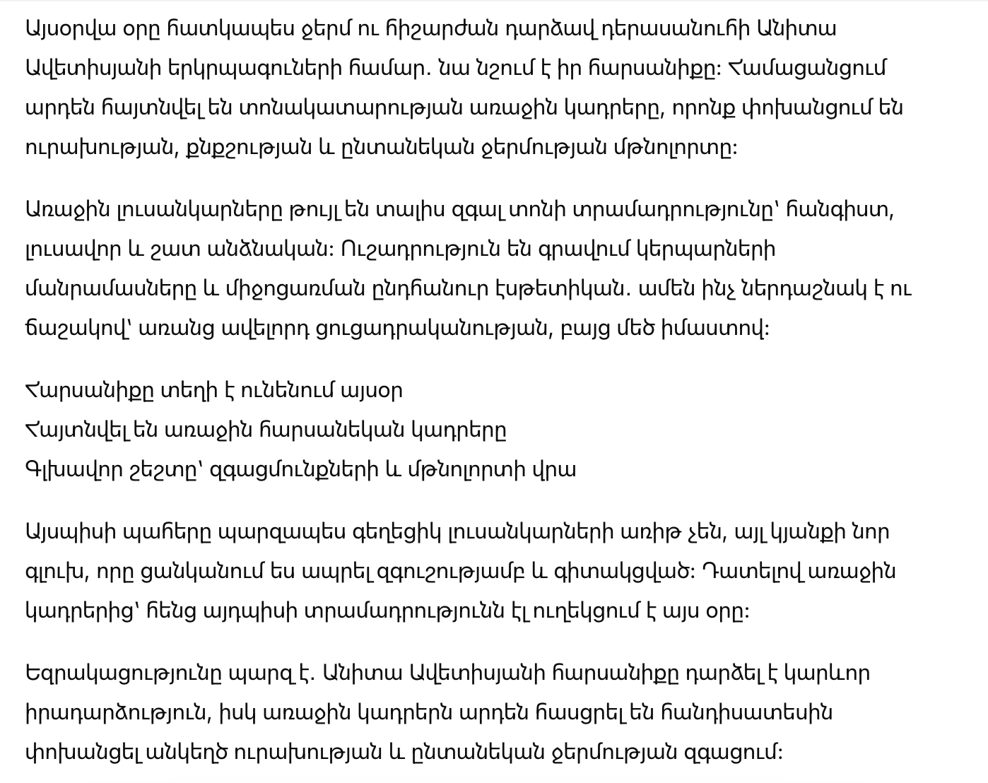Итог прост: свадьба Аниты Аветисян стала важным событием, а первые снимки уже успели подарить аудитории ощущение искренней радости и семейного тепла.