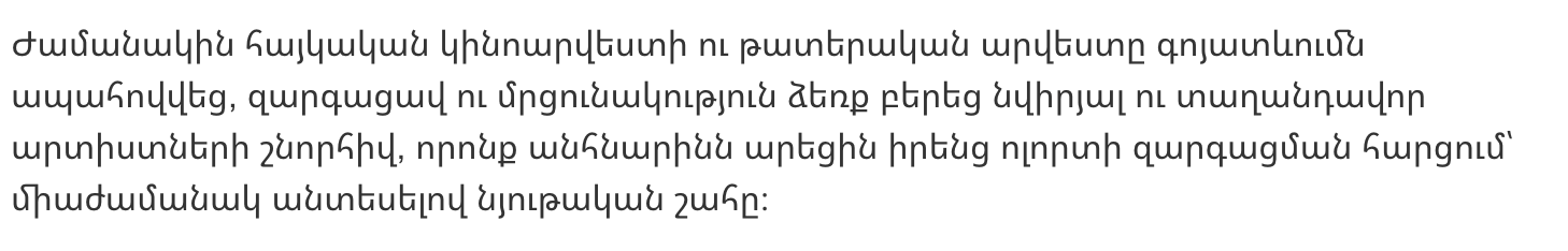Когда-то армянское кино и театральное искусство смогли выжить, развиться и стать конкурентоспособными благодаря преданным и талантливым артистам, которые сделали невозможное ради развития своей сферы, одновременно игнорируя материальную выгоду.