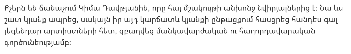 Немногие знают Киму Давтян, которая является одной из неутомимых служительниц армянской культуры. Она тоже прожила недолгую жизнь, но за это время успела выступить с легендарными артистами, а также занималась педагогической и ведущей деятельностью.