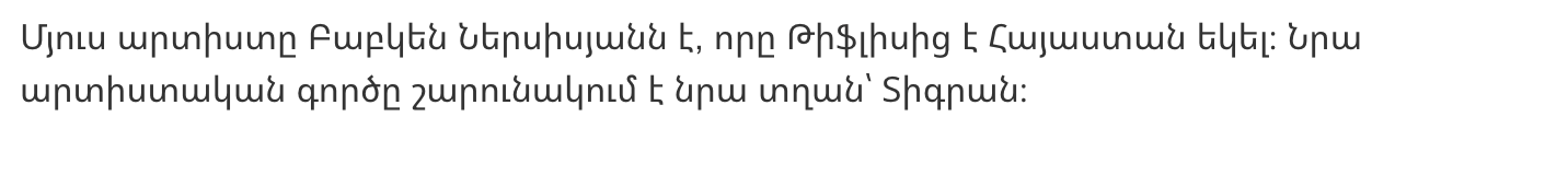 Ещё один артист — Бабкен Нерсисян, который приехал в Армению из Тифлиса. Его творческое дело продолжает его сын Тигран.