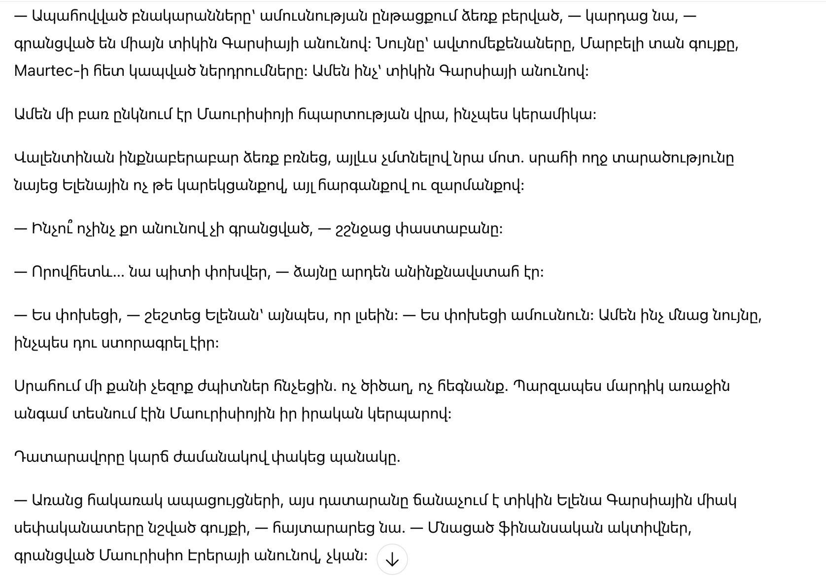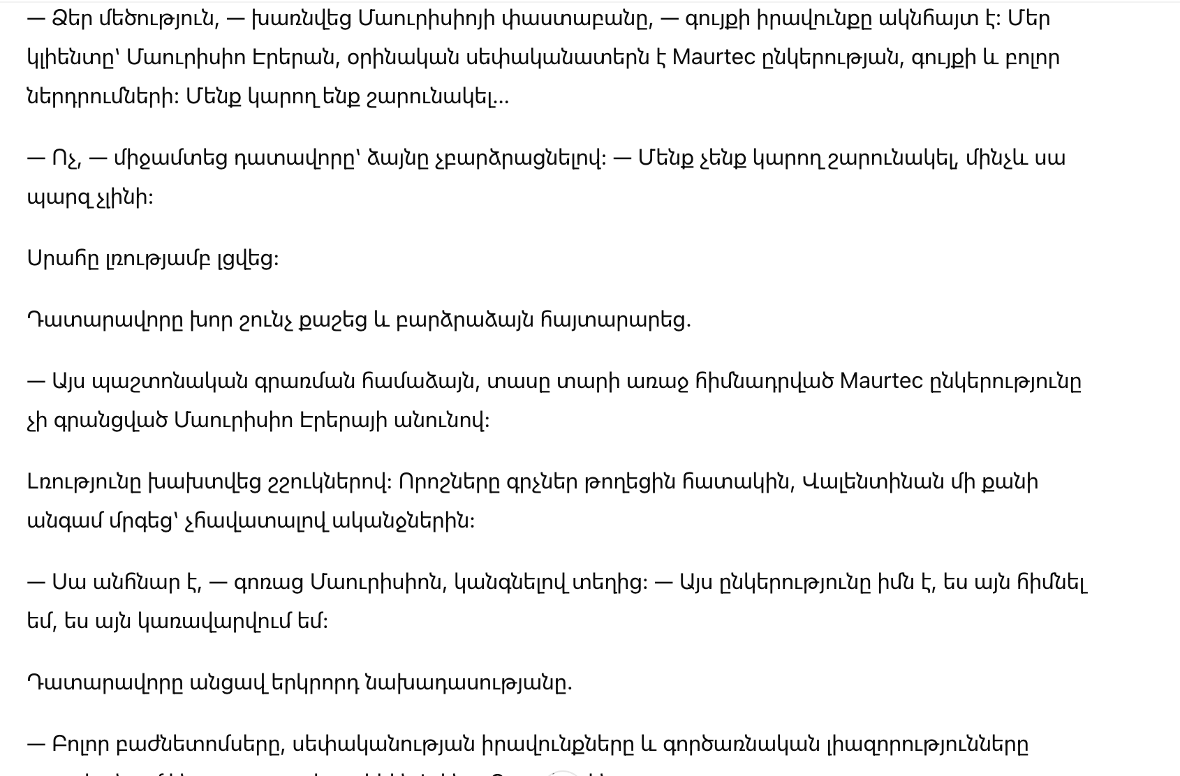 — Ваша честь, — вмешался адвокат, — право на имущество уже очевидно. Мой клиент является законным владельцем компании Maurtec, недвижимости и всех инвестиций. Мы можем двигаться дальше…