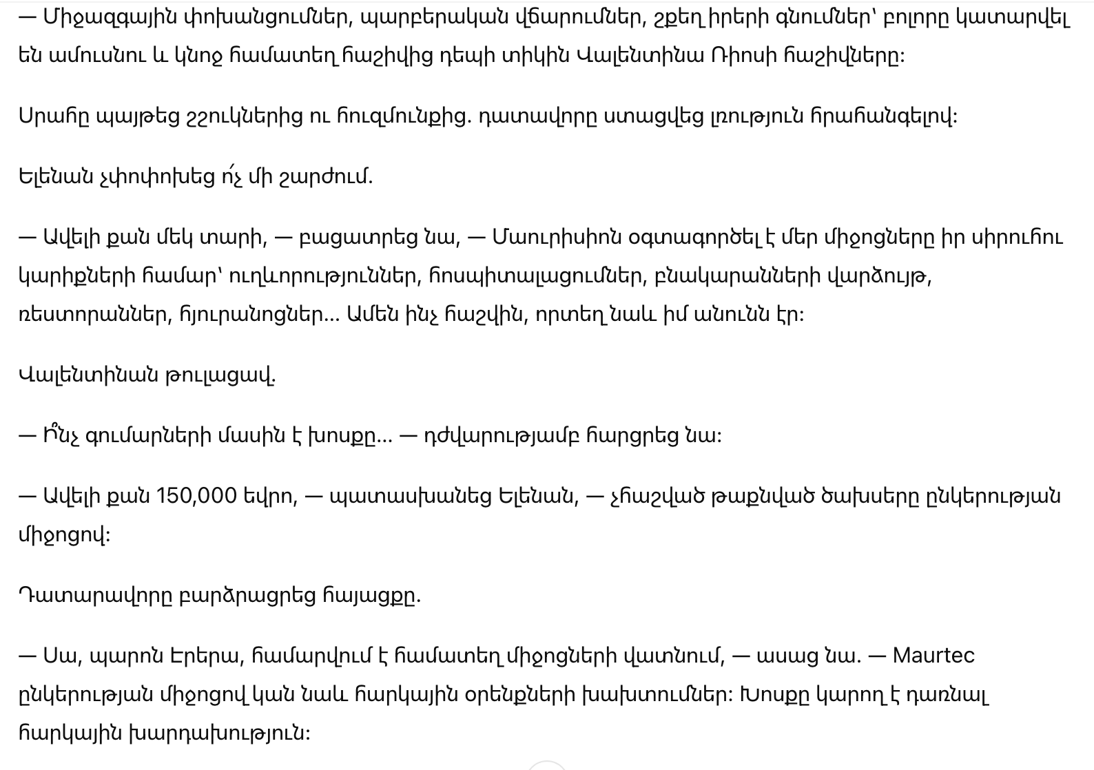 — Это, господин Эррера, представляет собой растрату совместных средств, — указал он. — И, согласно приложенному отчету, также имеются факты нарушений бюджетных законов через Maurtec. Мы говорим о возможном налоговом мошенничестве.